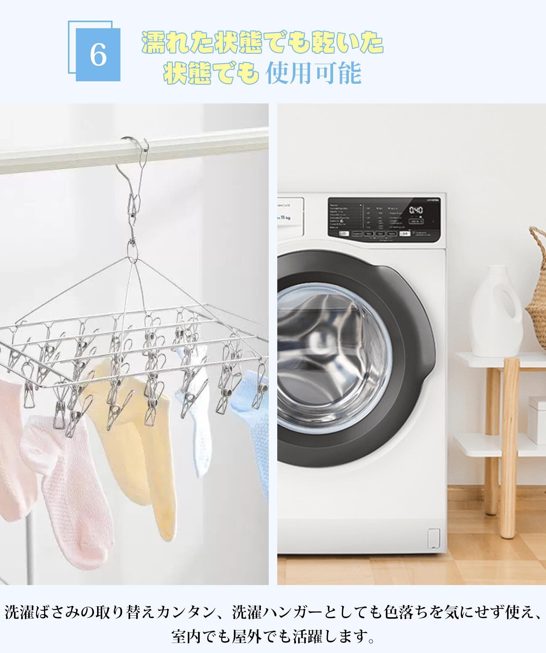 たっぷり36ピンチ & 使い勝手抜群 家族の洗濯にぴったりの36個のピンチ数を実現。靴下、下着、タオル、ハンカチなど様々な小物をまとめて干せて大満足。重い物は複数ピンチで挟むことをお勧めします。