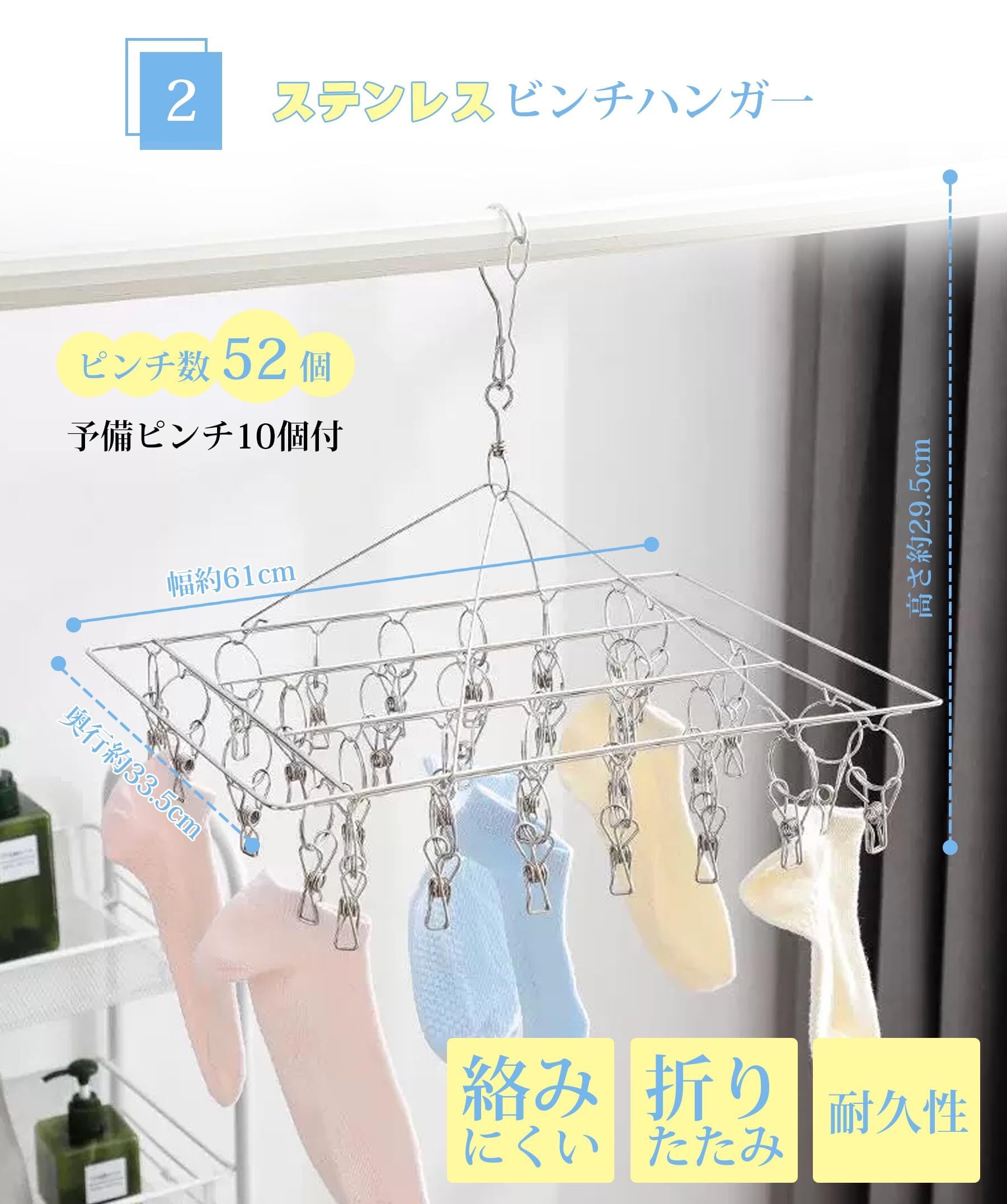 省スペース & 折りたたみ可能 コンコンパクトなフレームにピンチが密集し、竿スペースを圧迫しません。使用後は折りたたんで収納(約34×31×5cm)できるので、ベランダや室内の限られたスペースでも場所を取りません。