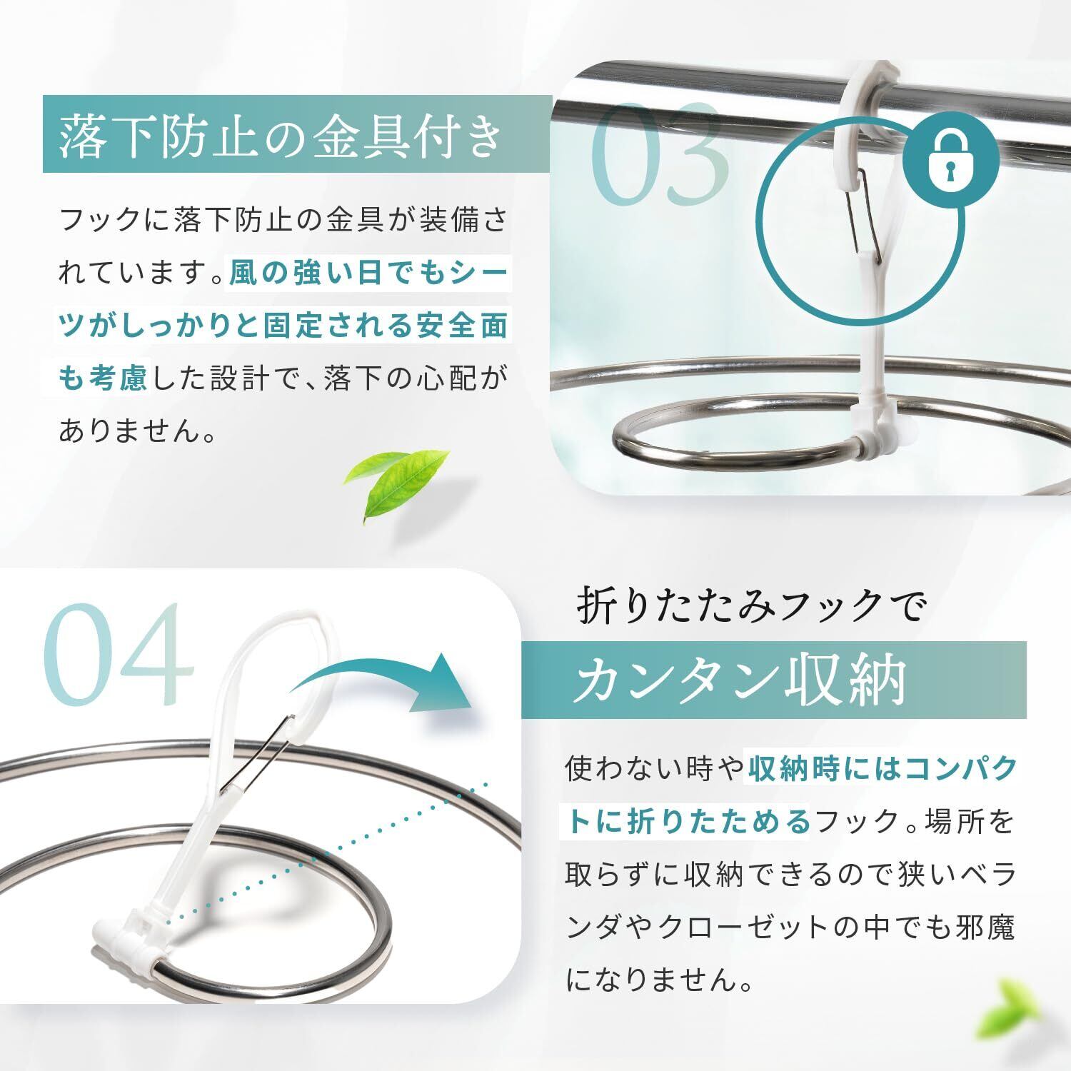 【 シーツハンガー 】 様々な バスタオルハンガー や タオルハンガー がありますが、当商品は360度回転しフックが折り畳めるシーツハンガーです。幅43cmで200cm分の長さのシーツ類を干せ、水平に回転するので干しやすく取り入れやすいうえに風に任せて回転するので乾きやすいです。フックを付け根で折りたためるのでコンパクトに収納が可能です。