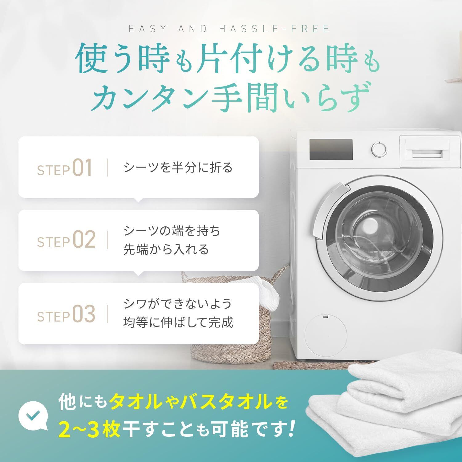 【様々な使い方を】 一般的タオル5~6枚、 一般的バスタオル幅60cm3枚、 大判バスタオル2枚そのほかにも布団カバー タオルケット 敷きパッド カーテン ガーゼケット バスマットなどを干すことができます。