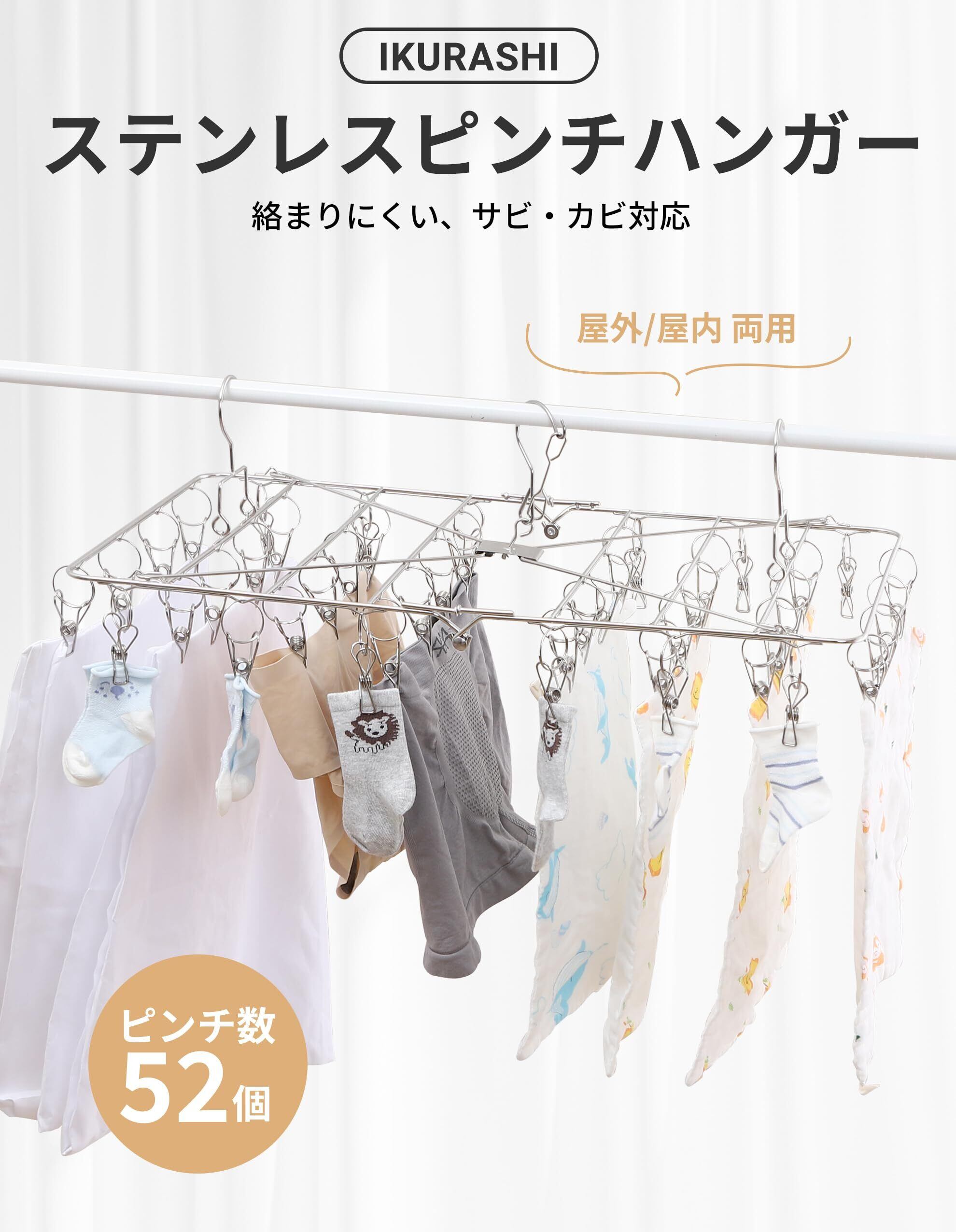 ステンレスピンチハンガー 52ピンチ 洗濯ハンガー オールステンレス 角ハンガー ピンチハンガー 室内外両用 落ちにくい 回転式 洗濯 タオル 銀色 アイクラシ(Ikurashi)