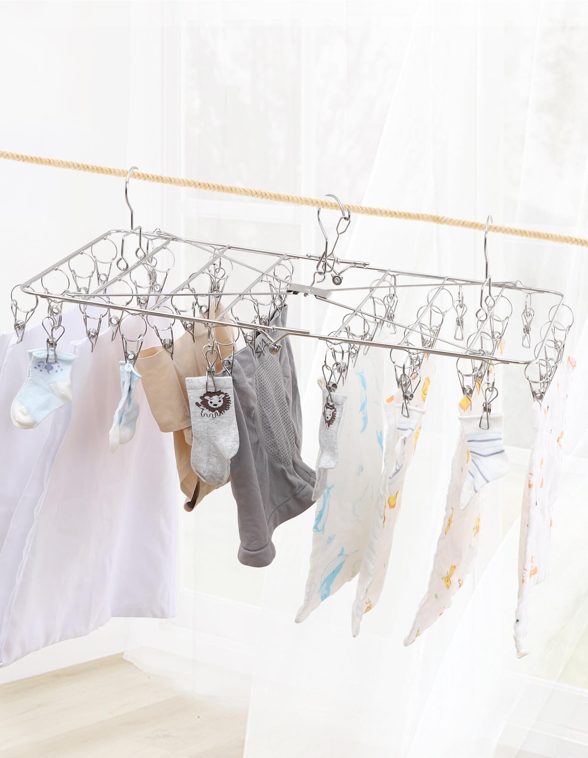 【首振り回転式フックで、ラクラクな乾燥体験を!】360度全方位に回転するため、風に合わせて自由に動き、隅々まで快適に乾燥できます。落下防止のロック設計とダブルフック設計で風が吹いても心配なくお使いいただけます!