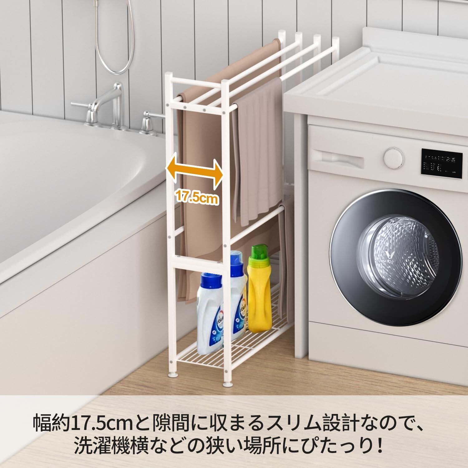 【スリム設計・隙間にピッタリ】タオルラックは幅わずか17.5cmのワゴンは洗面所などの狭いスペースに収まるスリム設計なの、隙間にピッタリ、トイレ横に置いても邪魔になりません。洗面台の横、お風呂場、浴室、トイレの中など様々なシーンで大活躍します。場所をとらなくて、収納ができるので便利です。
