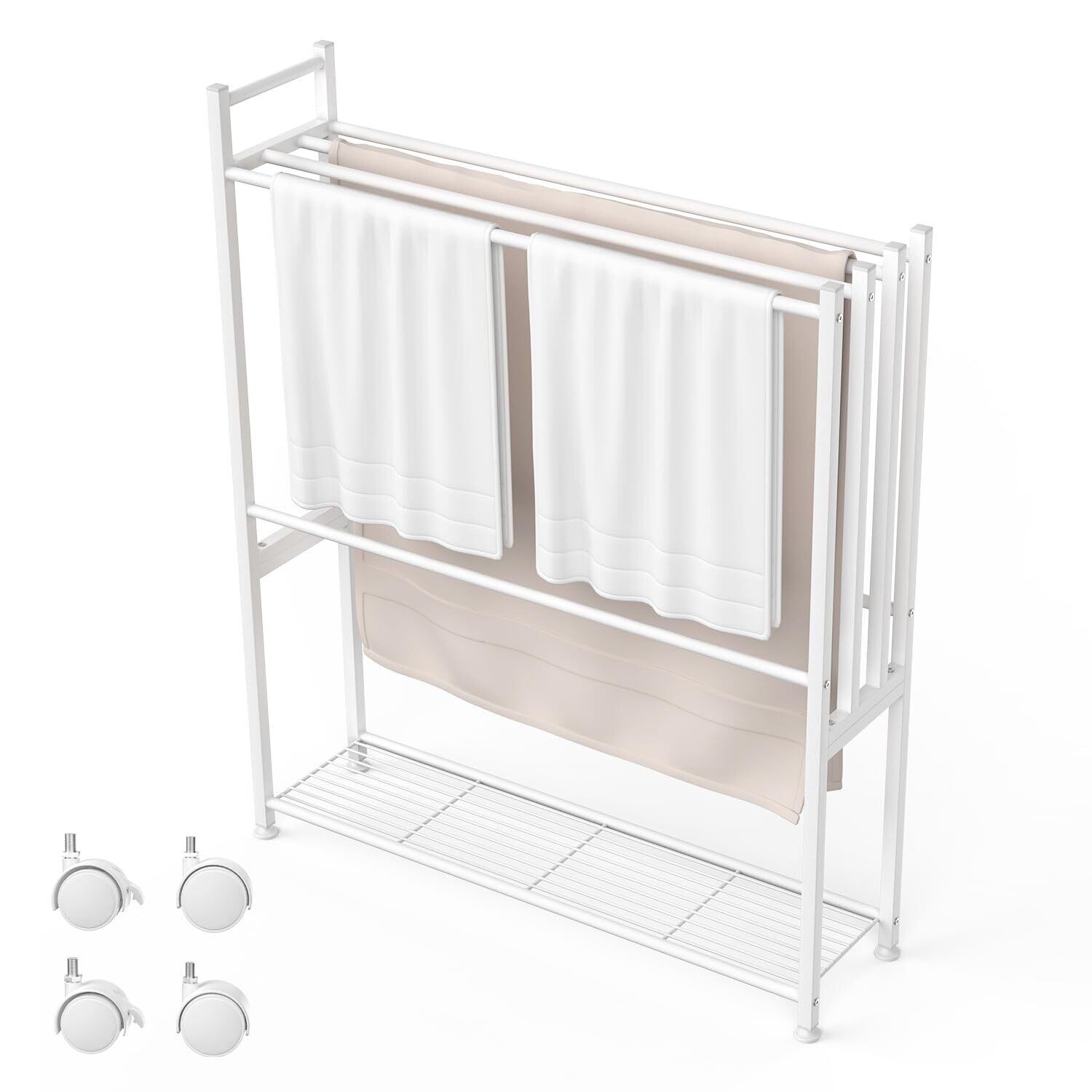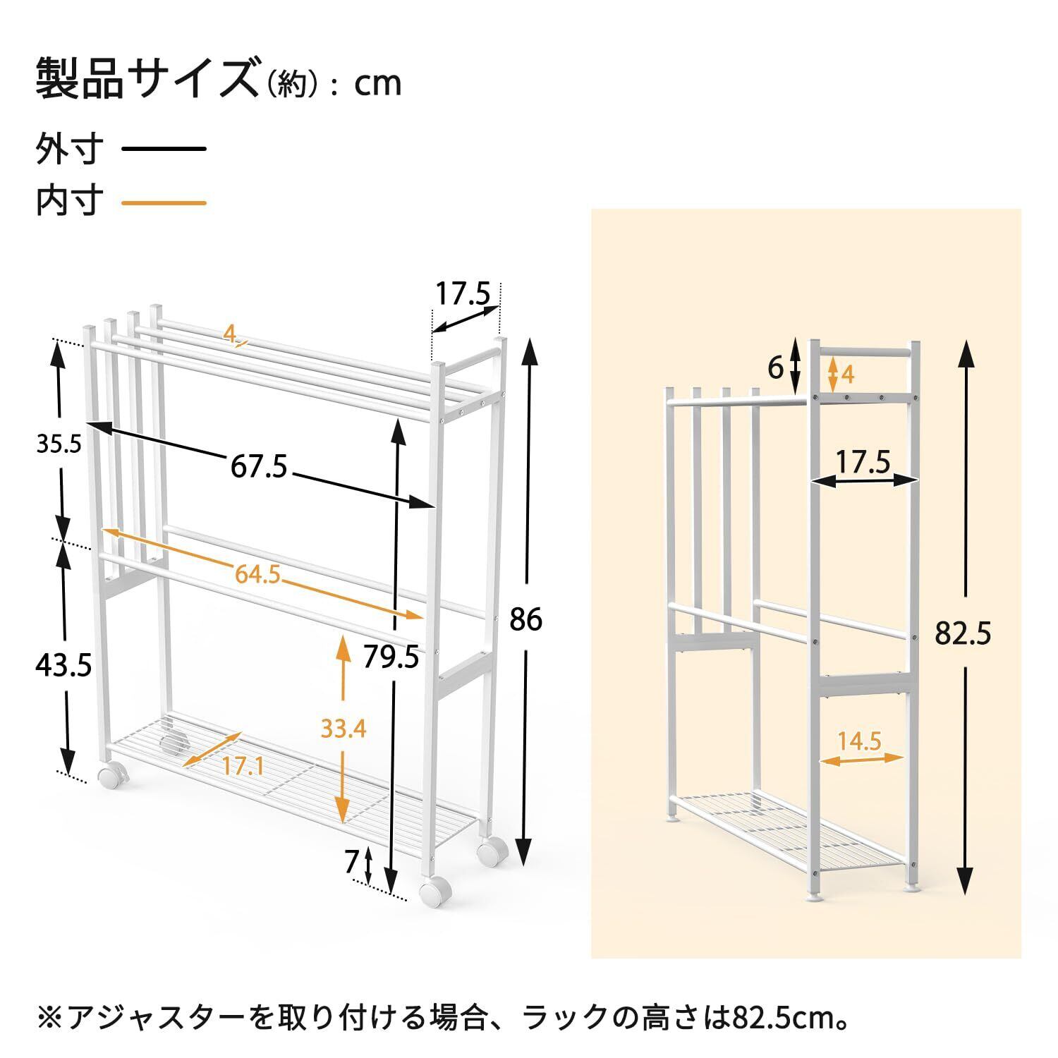 UTIMIU バスタオルスタンド バスタオルハンガー スリム 横から掛けられる 物干し ハンガー タオル ラック 大判サイズ対応 ふきん掛け バスタオル掛け棚付き キャスター付き アジャスター付き 浴室 洗面所 トイレ 風呂場 隙間収納 ワゴン 約W67.5×D17.5×H86cm (ホワイト)