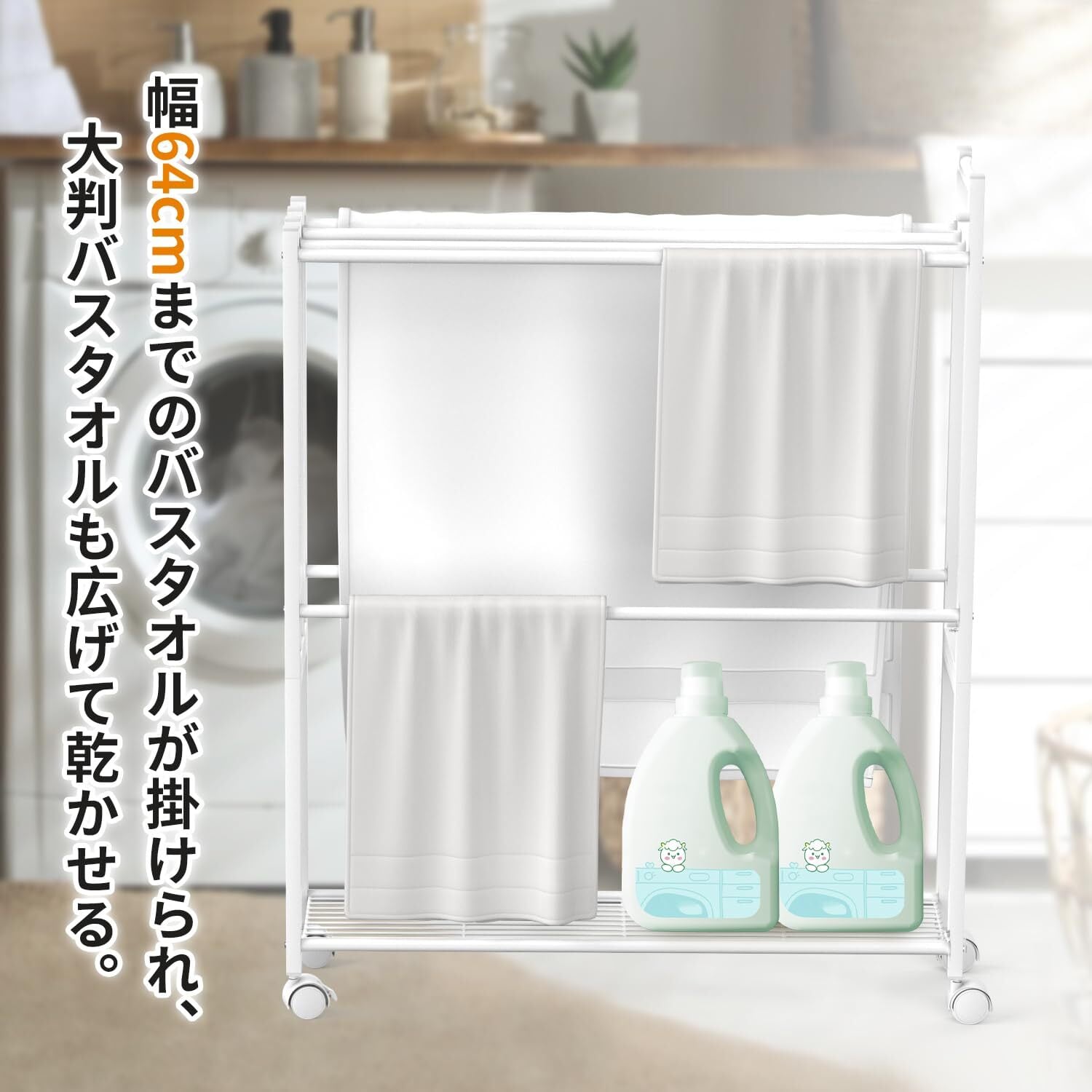 【横から掛けられる】タオル/バスタオルスタンドは横にフレームがないデザインで、タオルやバスタオルを横から掛けられ、取り出す時にも楽々です。幅67.5cmデザインは、大判バスタオルも広げて乾せます。【製品仕様】サイズ(約):幅67.5×奥行17.5×高さ86cm(キャスター装着する場合)、幅67.5×奥行17.5×高さ82.5cm(アジャスターを装着する場合)。耐荷重:上段ポール:各1kg、中段フレーム:各1kg、下段メッシュ棚:5kg。