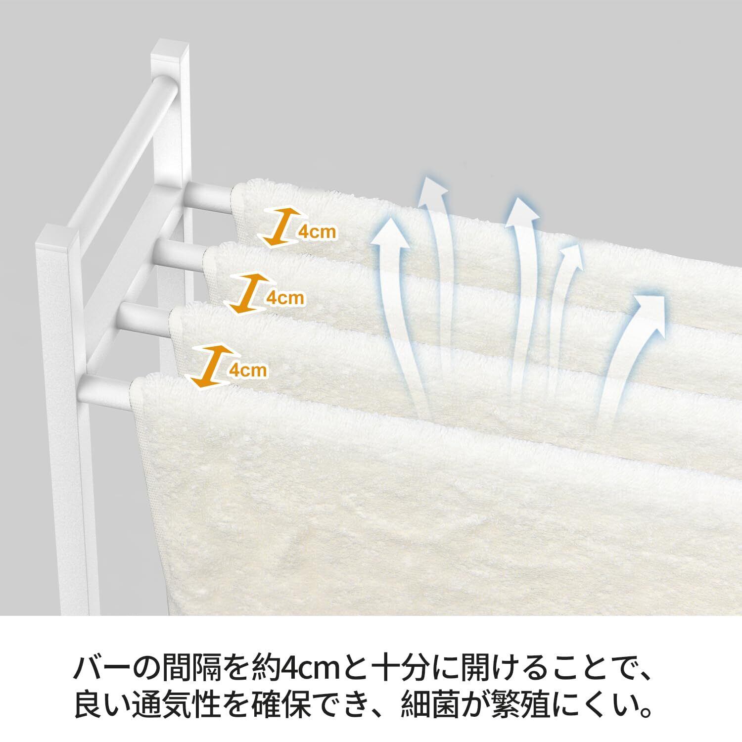 【風通し良い】バーの間隔を4cmと十分に開けて、良い通気性を確保し、細菌が繁殖にくく、タオルがさらさらな状態を保ちます。同時に4枚のバスタオルと2枚のバスマットを掛けられ、家族分のタオルを干せます。