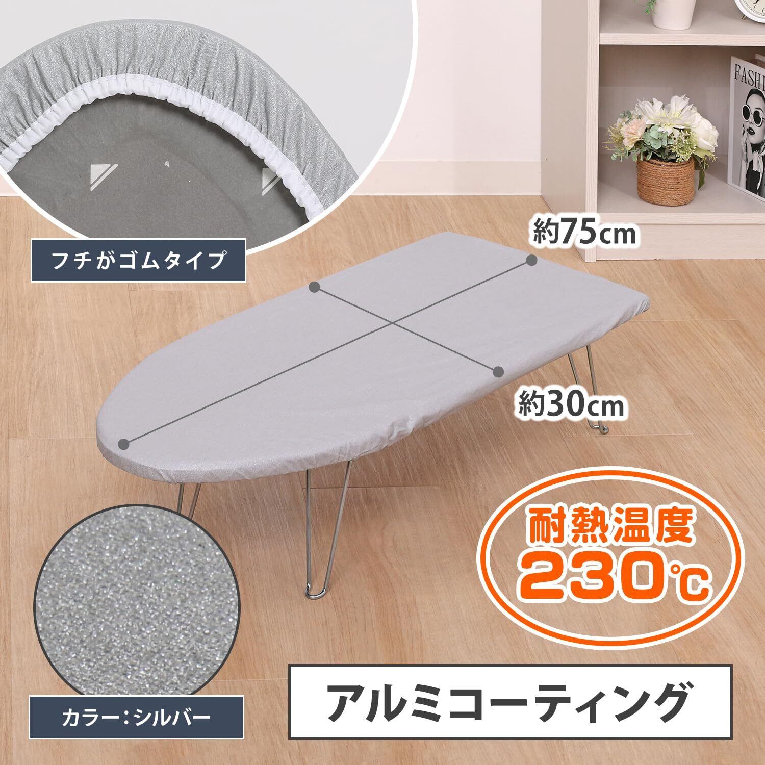 【商品仕様】:サイズ/約30×75cm、カラー/シルバー、内容/1枚、適応サイズ/約30~35×75~77cmの舟型のアイロン台、材質/綿(アルミコート)