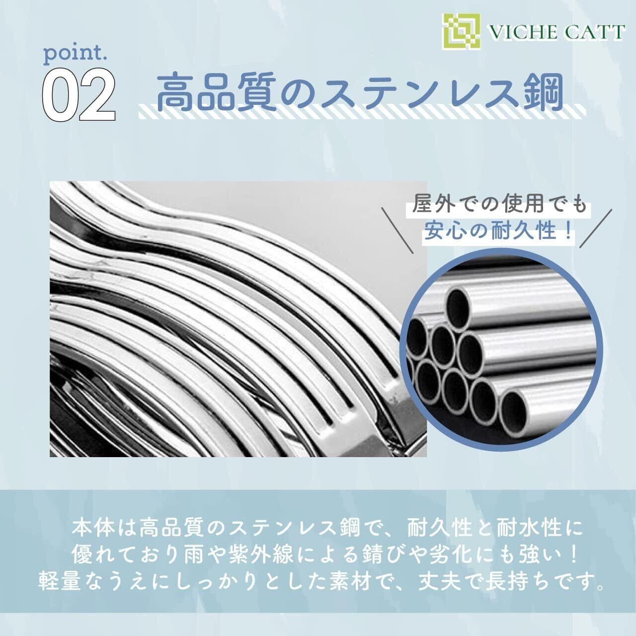 本体は高品質のステンレス鋼で、耐久性と耐水性に優れており雨や紫外線による錆びや劣化にも強い!軽量なうえにしっかりとした素材で、プラスチック製に比べて丈夫で長持ちしてくれます。