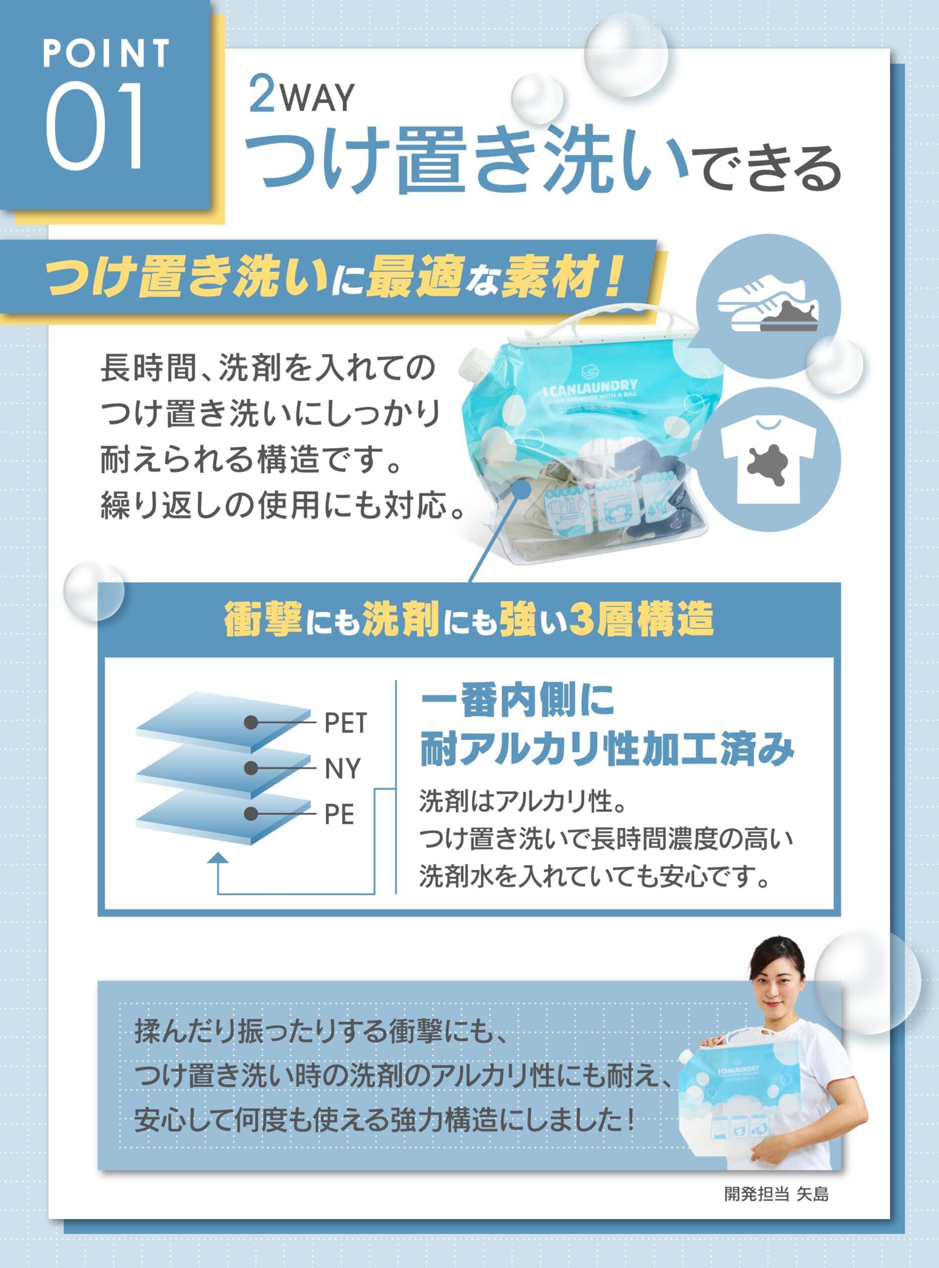 【6L対応でしっかり洗える】 ゆとりある6Lサイズ&広めのスペースで、衣類がしっかり動くから洗浄力◎。 厚手の耐久素材なので、つけ置き洗いにも安心して使えます。