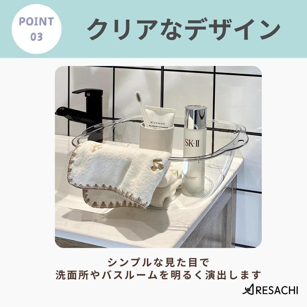 【クリアなデザイン】クリアなデザインで作られた洗面器は、どんなインテリアにも合わせやすいです。シンプルでスタイリッシュな見た目が特徴で、洗面所やバスルームを明るく演出します。使用しないときも、スッキリとした印象を保ちます。