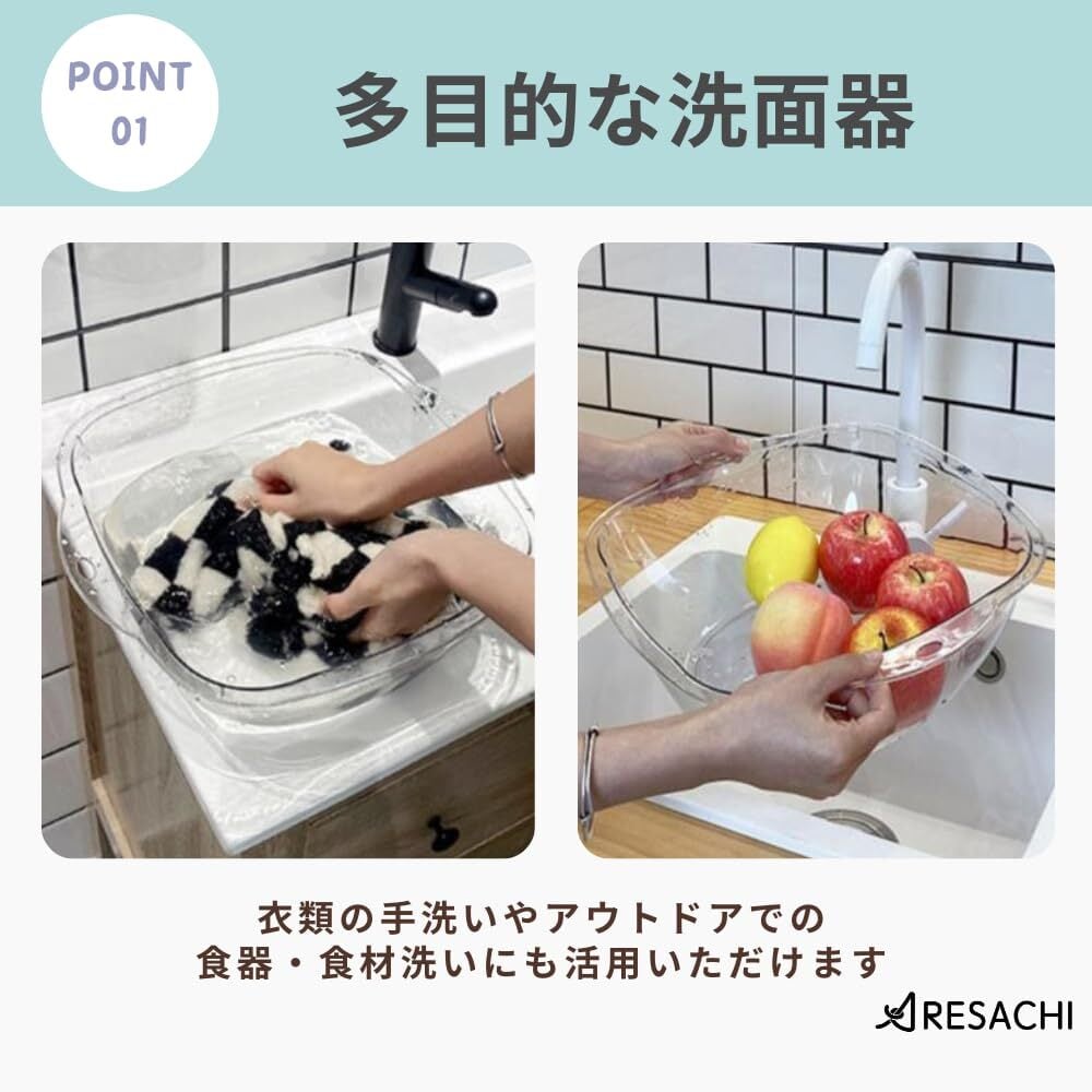 【多目的な洗面器】顔をしっかり洗ったり、髪を流したりできます。洗濯時にはデリケートな衣類を優しく手洗いでき、掃除の際には小物を洗うのに役立ちます。また、アウトドアでもピクニックやキャンプで手洗いや食器洗いに重宝します。さまざまなシーンで活躍するこの洗面器をぜひ活用してみてください。