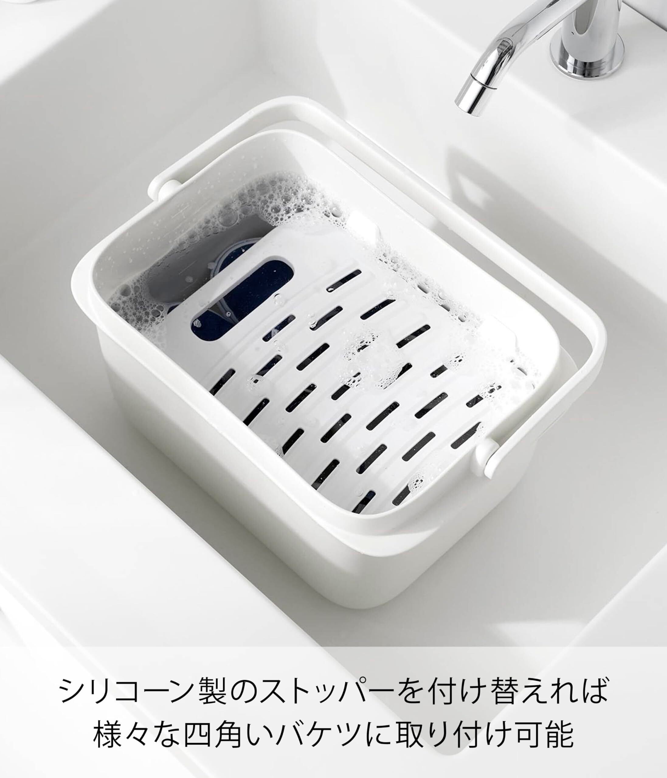 シリコーン製のストッパーを付け替えることで、様々な四角いバケツに取り付けることができる浸け置き板です。
