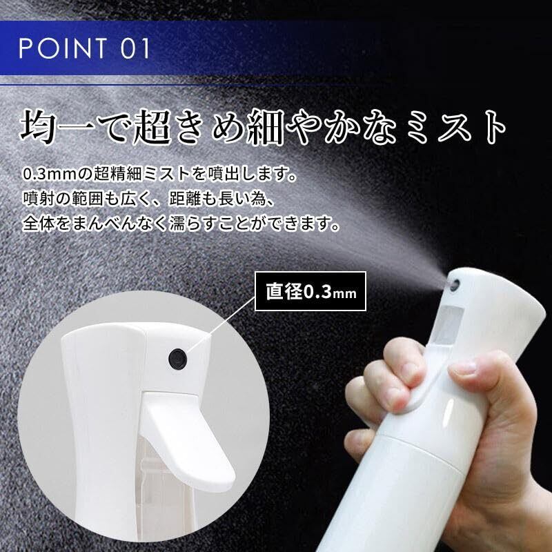 【微粒ミストを噴霧する】0.3mmのノズルによりワンプッシュで煙のような微細なミストを約2秒間噴射できるスプレーボトル。