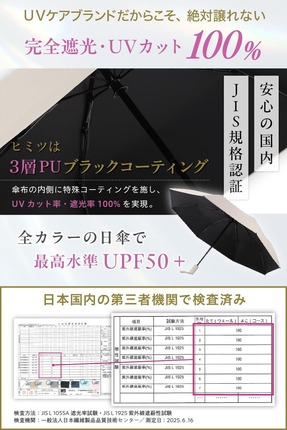 【国内第三者検査機関にてUVカット率100%の実証済】日本の国家規格、JIS規格1925にてUVカット率100%を実証。JIS規格1055にて遮光率100%の実証済み!完全遮光の最高級日傘です。