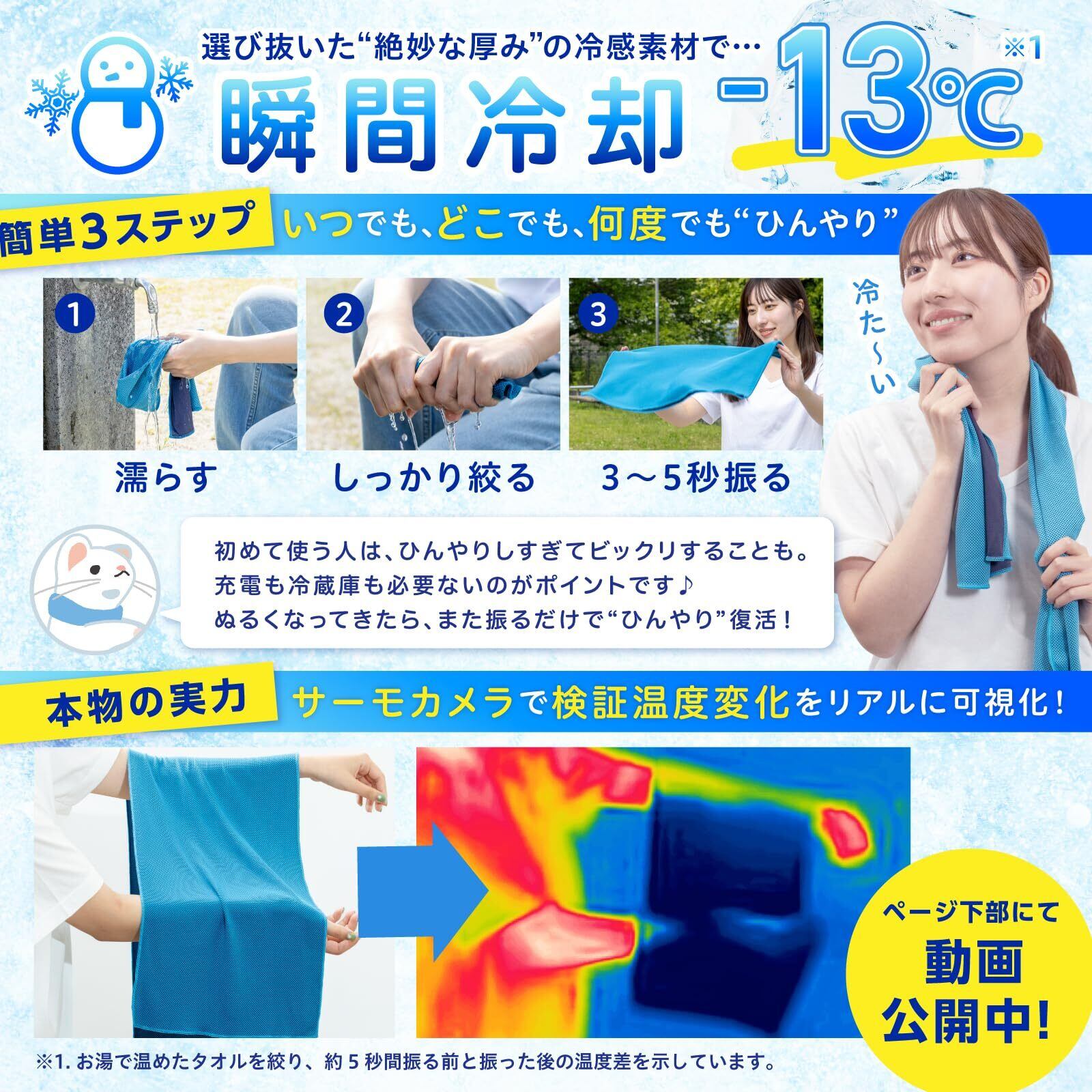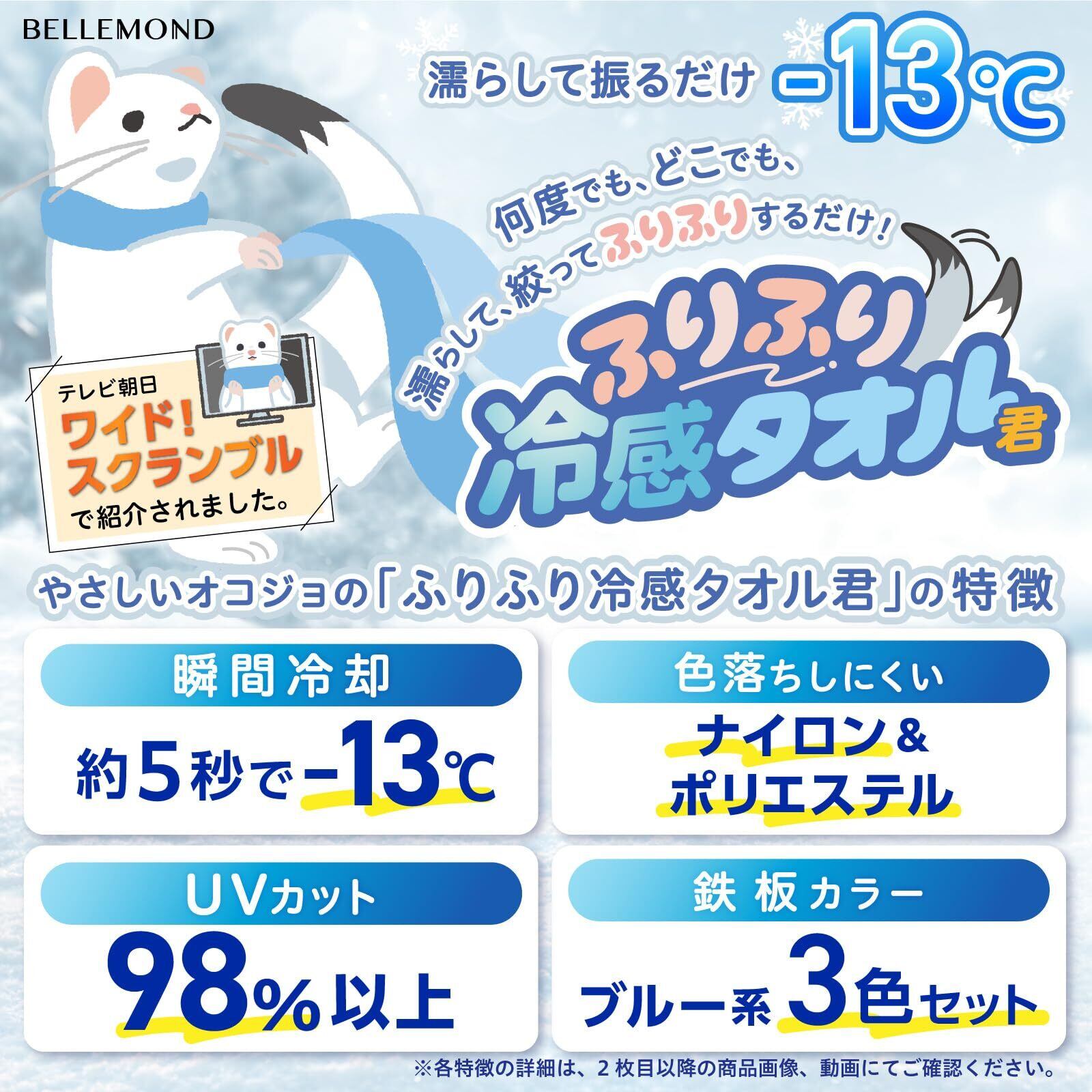 テレビ朝日「ワイド!スクランブル」、「おぎやはぎのハピキャン」で紹介されました!▶【ふりふり冷感タオル君】:夏の猛暑や熱中症対策に!福岡県に本社を構えるBELLEMOND(ベルモンド)の「ふりふり冷感タオル君」は、濡らして約5秒振るだけで瞬時に冷えるタオルです。【約5秒で-13℃】:お湯で温めたタオルを絞り、約5秒間振る実験を検証したところ、振る前と比べて温度が13℃下がることが確認されました。(ページ下部の動画にてご確認ください)