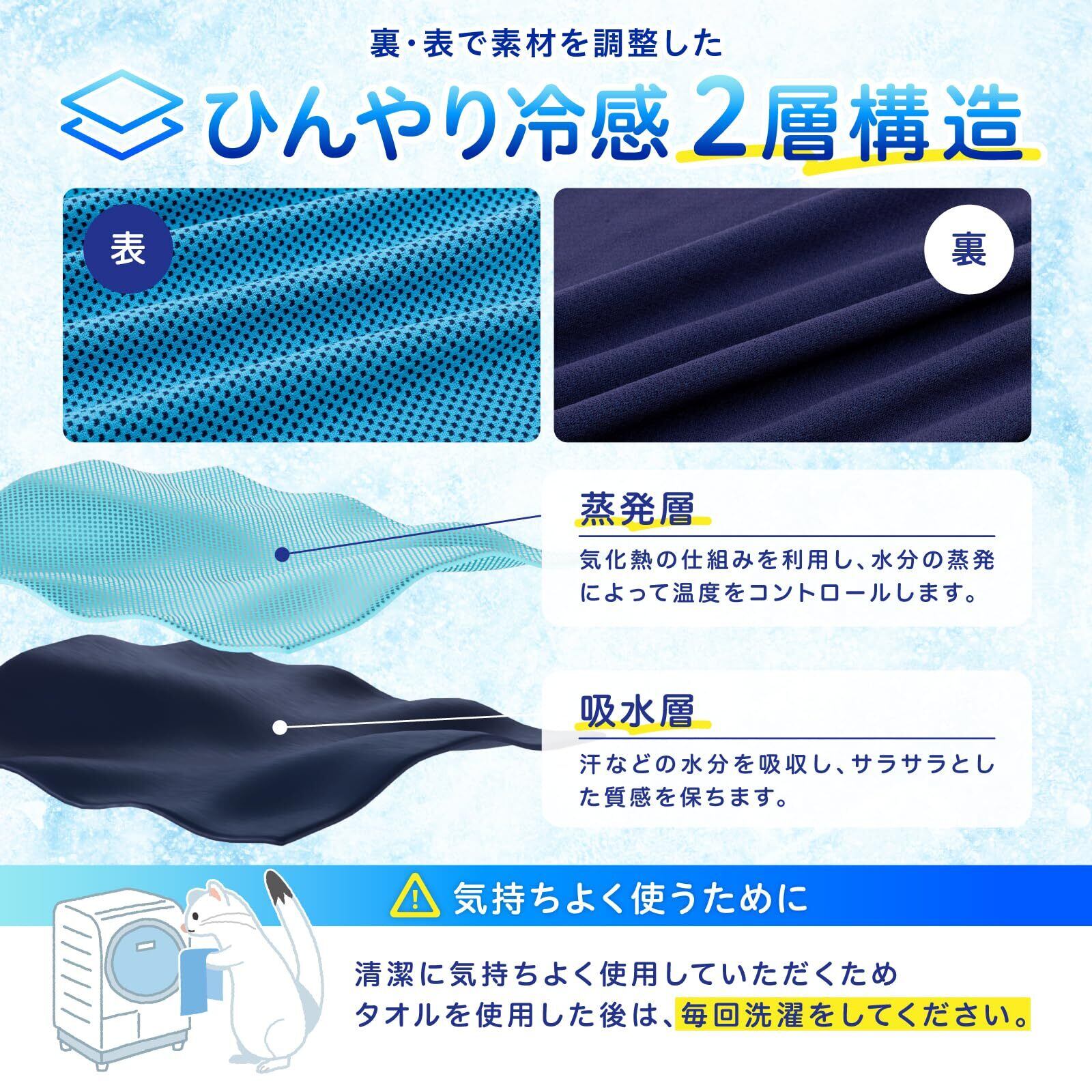 ▶【ひんやり冷感2層構造】:当商品は蒸発層と吸水層の2層構造となっており、絶妙な厚さで高い冷却効果を実現しています。▶【UVカット効果】:最大98%のUVカット効果で、日焼け対策にも優れています。(UVカット効果は、3色とも第三者機関にて検査を行い実証されています。)