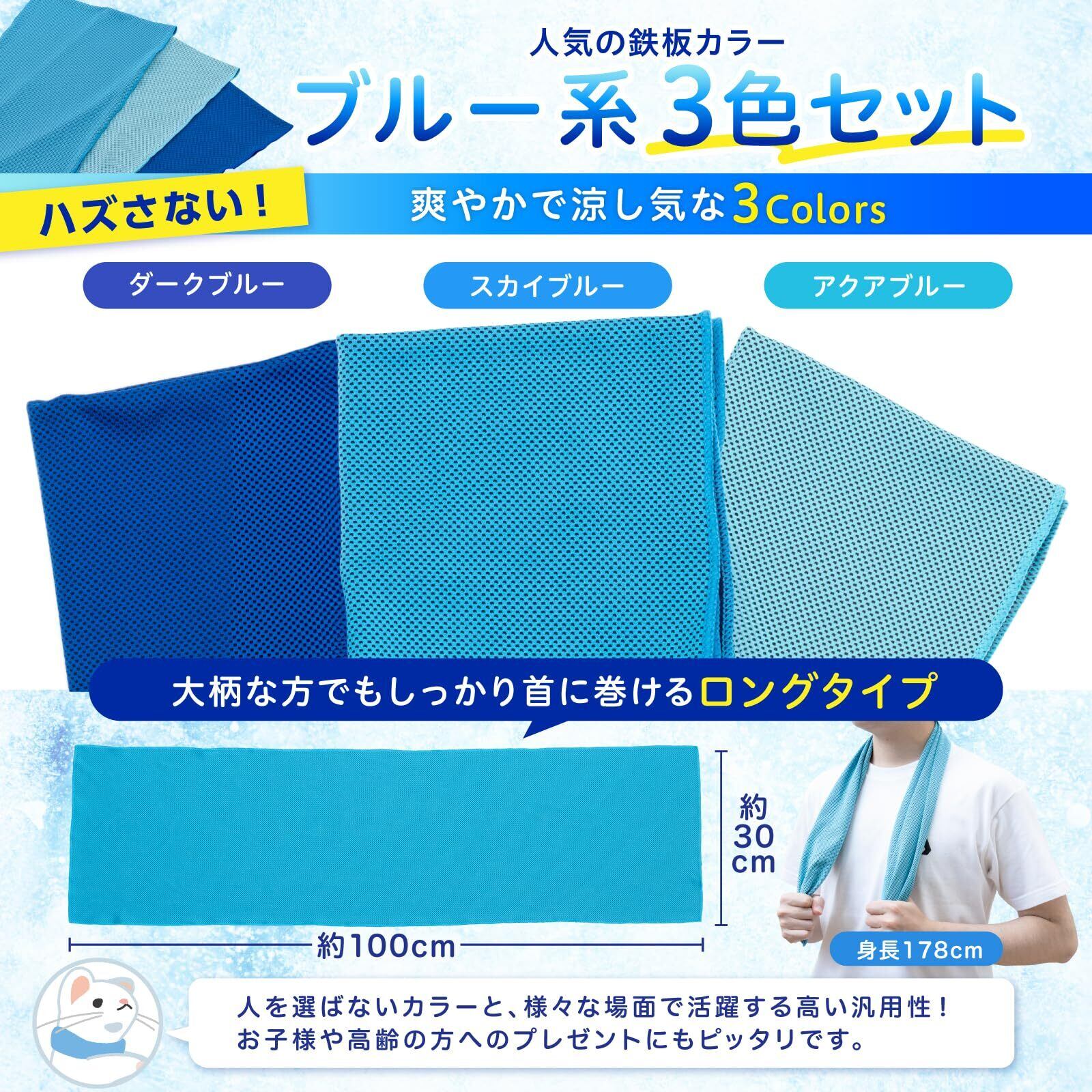 ▶【商品仕様】:サイズ: 30cm x 100cm / カラー: ダークブルー、スカイブルー、アクアブルーの3色セット▶【使用方法】:※初めて使用する前に、必ず洗濯してください。STEP1.タオルを濡らす→STEP2.タオルをしっかりと絞る→STEP3.タオルを3~5秒ほど振る。この3STEPでタオルを冷却できます。タオルがぬるくなったら、再度振ることでひんやり冷えます。また、風が無い場合はハンディファンなどで風を送ることで快適に使用できます。