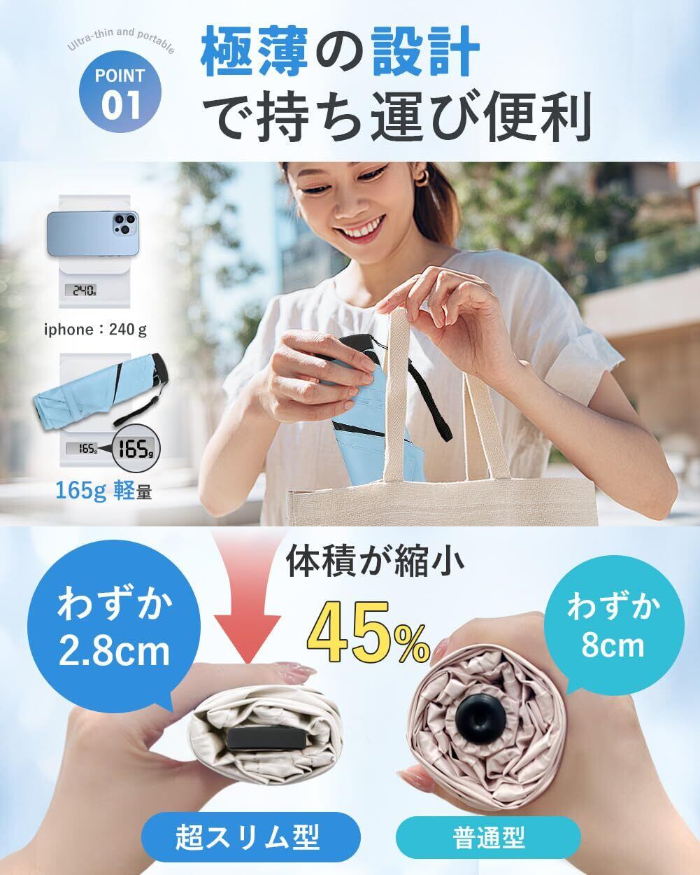【超軽量&携帯便利】この男女兼用折りたたみ日傘はコンパクトのデザインで、折りたたみ時のサイズは22×7.5×2.8cm、重量は約165g、とても小さくて軽いです、収納ケースも付いております。非常にスリムでコンパクトなので、バッグにすっぽり入れて、突然の雨や思わぬ日射しに大活躍してくれます。通学、通勤、遠足、旅行,出張など幅広くご利用できます。