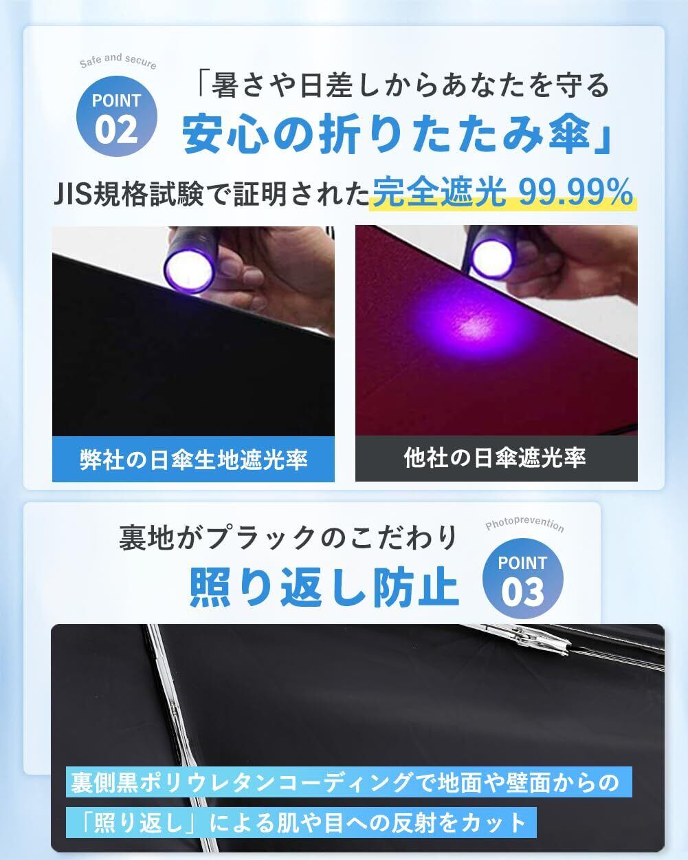【完全遮光UPF50+&日焼け止め】紫外線を99.9%以上カットできる折り畳み日傘です。【国内第三者検査機関による確認済】日傘布の裏側は黒ポリウレタンコーディングを採用して、上からの日差しを通さずに反射して、下からの輻射熱が黒で吸収して、眩しい感じも軽減してくれます。大切なお肌を太陽光線、紫外線からガードでき、炎天下でも遮光性パッチリ。日傘をさすと暑さもやわらげて、日焼け防止でありながら、熱中症対策にもなり、これ一本あれば、真夏の日中も気軽に歩けます。