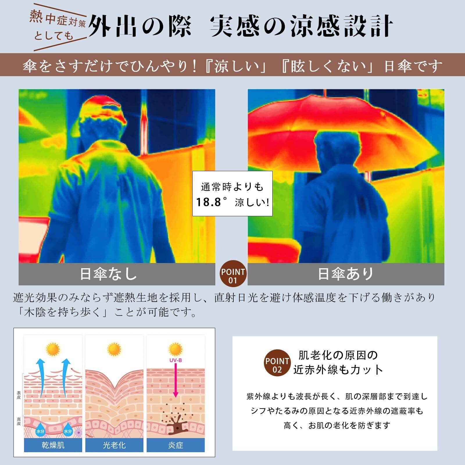 【攻撃的な暑さから体を守る、高い遮熱性】日傘の内側に施されたブラックコーティングが太陽の照り返しを吸収し、赤外線や可視光線を最大限カット!体の表面温度を最大18.8℃下げることができます。紫外線から肌を守るだけではなく、攻撃的な暑さからカラダを守れるよう、UVは高い遮熱性を実現しています。真夏の熱中症対策などにもぴったりの日傘となっています。