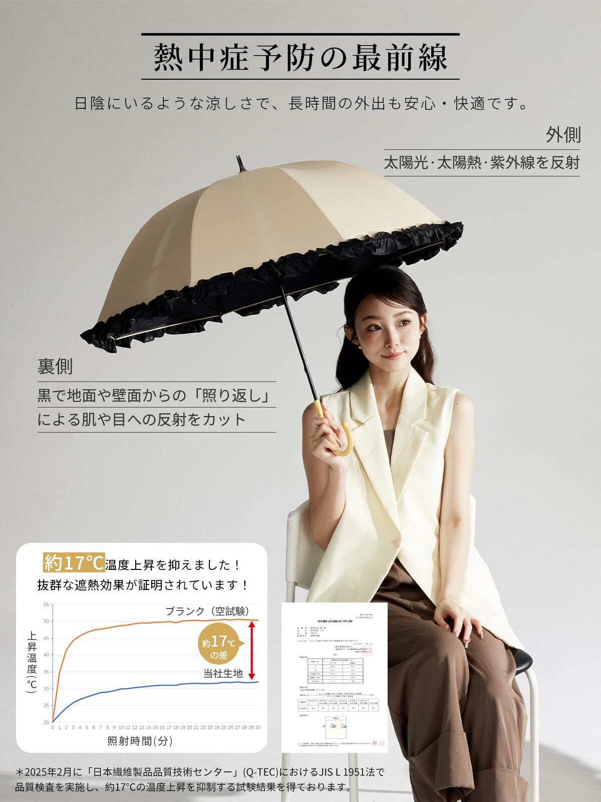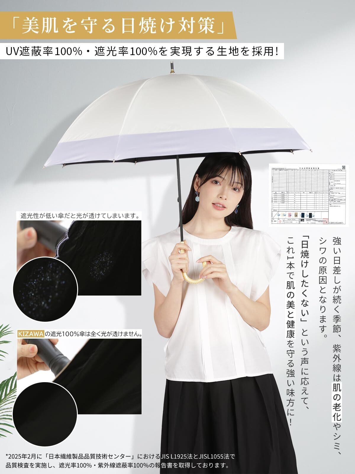 【遮光率100%・UV遮蔽率100%】太陽光線を完全にカット!検査機関日本織維製品品質技術センター(QTEC)において、JISで定められた測定方法により検査を実施し、遮光率100%、UVカット率100%、UPF50+が示された高機能の日傘長傘です。生地自体のカット率100%と1級遮光を達成!生地裏ブラックコーティング加工を施している生地を採用しているので、裏地黒いでしっかりとした質感で太陽光を遮断します。完全に日差しを防ぎ、紫外線対策にはピッタリのアイテムとなっています。(2023年1月に「日本繊維製品品質技術センター」 (Q-TEC) におけるJIS L 1055 A法で品質検査を実施し生地の遮光率100%とUVカット率100%の生地品質検查報告書を取得しております。)