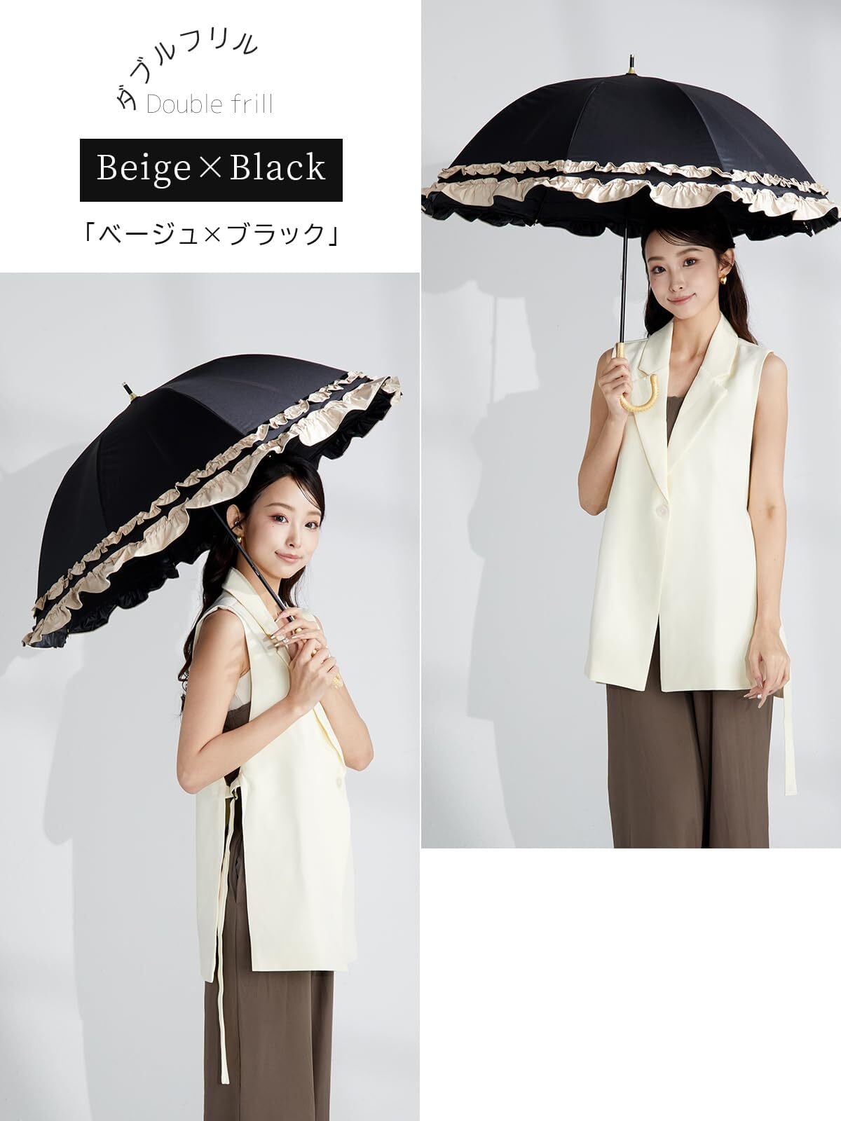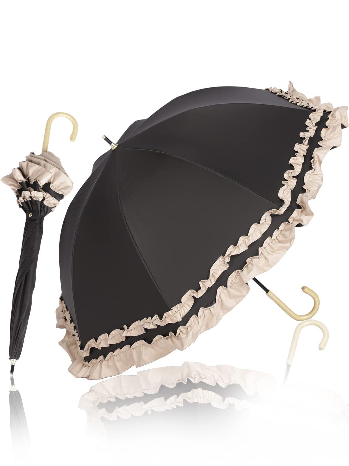 KIZAWA 日傘 uvカット 100 遮光 長傘 深張り 完全遮光 日傘兼用雨傘 レディース 5級撥水 ドーム 軽量 フリル 晴雨兼用 遮熱 かわいい 丈夫 母の日 プレゼント ラタン 持ち手 親骨50cm