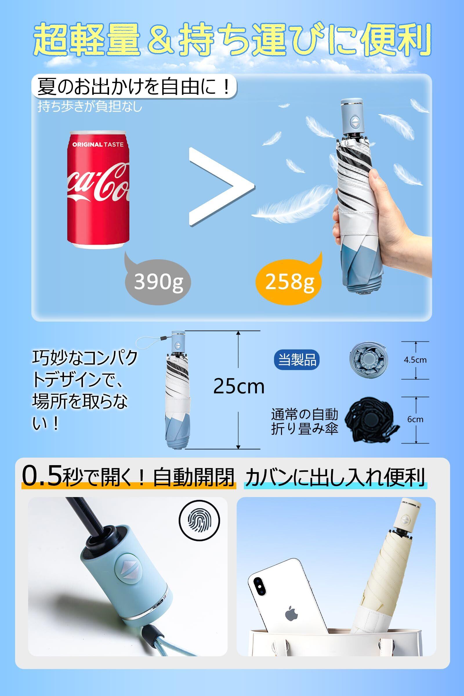 【コンパクト&軽量設計】夏のお出かけを自由に!258gの軽い設計で、持ち歩きがストレスフリー。折り畳めば25cmの巧妙なサイズで、バッグやポケットにスッキリ収納、どこへ行くにも気軽に携帯!サッと広げて瞬時に日差しをカット、使わないときはスマートにしまえる。耐久性も兼ね備え、毎日のお供に最適。