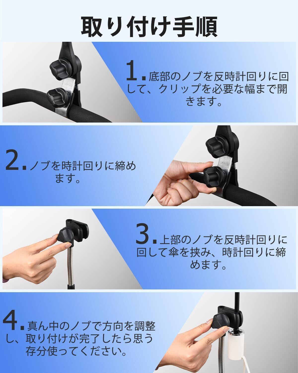 【組立不要 & 取り外し簡単】このベビーカー 傘スタンドのシンプルなクランプオン設計により、数秒で素早くセットアップできます。小さなナットを緩めたり締めたりするのにレンチを持ち運ぶ必要はなく、ノブを締めるだけです。手間をかけずに時間を節約できます。