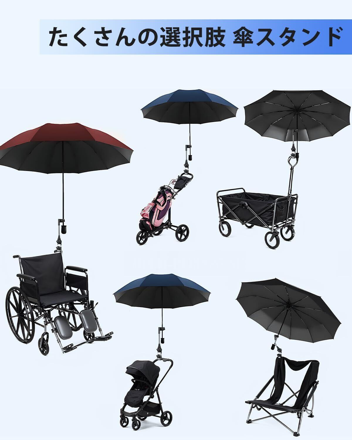 【ユニバーサル互換性】この傘マウントホルダーは、ほとんどのベビーベビーカー、椅子(ビーチチェア、キャンプチェア、パティオチェア、折りたたみ椅子を含む)、自転車、さすべえ 自転車、電動自転車、ゴルフプッシュカートに適合します;調節可能な傘クランプにより、最大直径1.6 CMの傘柄固定をサポートし、屋外でのリラクゼーションに最適です。