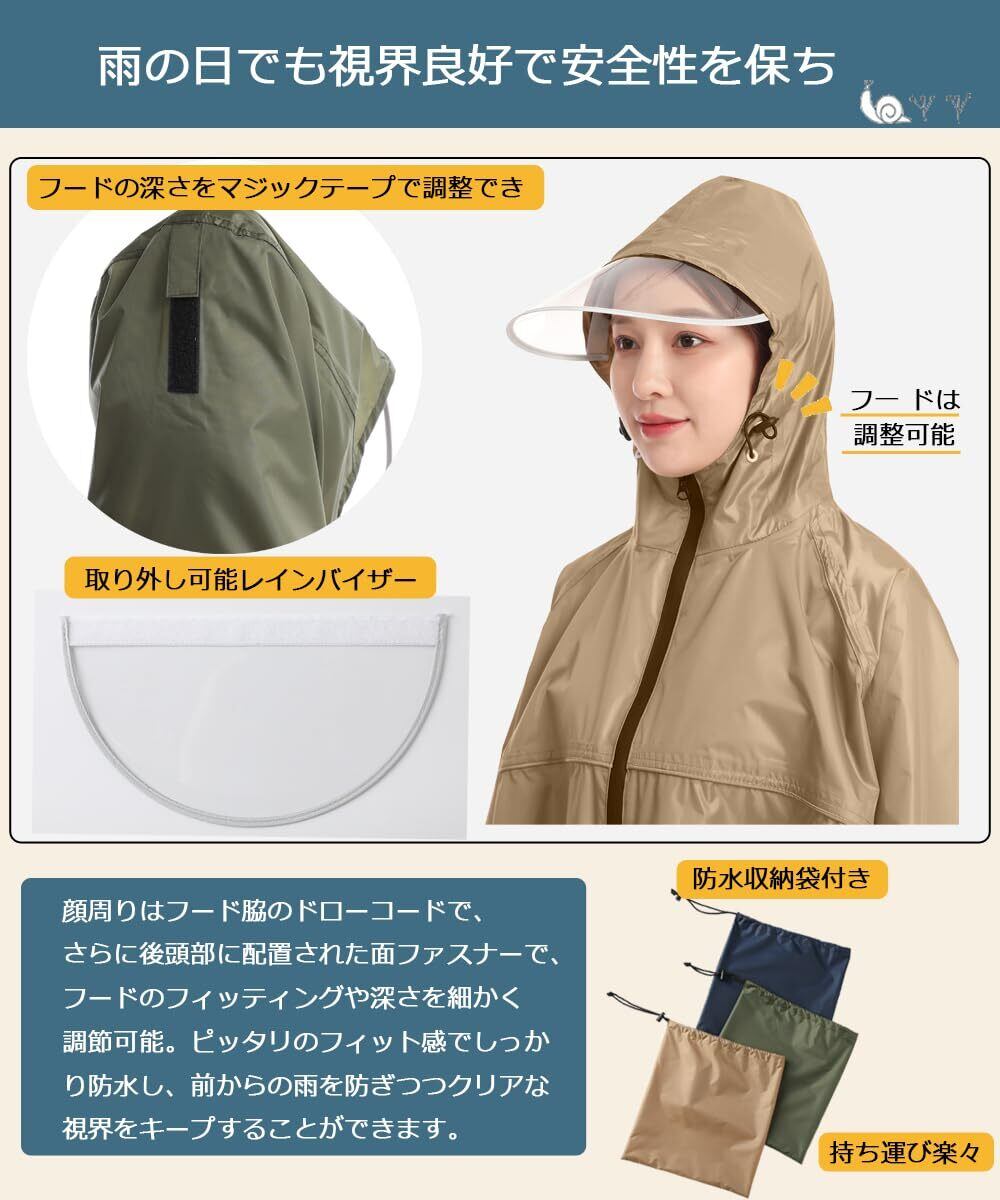 【パッケージ内容】レインコート本体、バイザー取り外し可、 レッグカバー、 収納袋。【収納について】 着用後、風通しのよいところでハンガーなどにかけて陰干ししてください。乾いた後、軽く畳んで保管してください当店スタッフも実際に雨の日にレインコートを使用しております。日々お客様に満足していただけるよう商品作りをしております。どうぞよろしくお願いいたします。