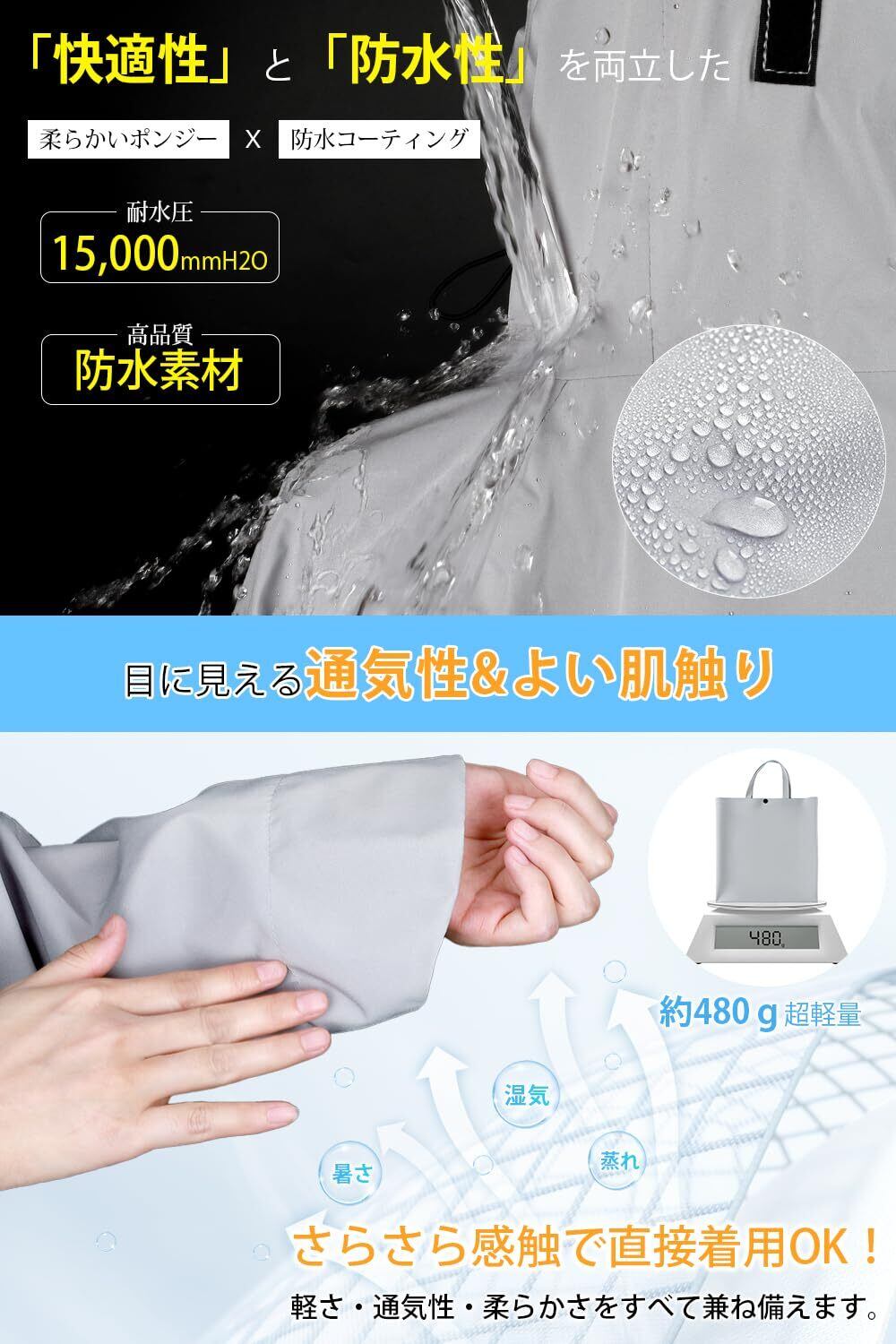 ①【とにかく使いやすい!快適レインポンチョ】 「サッと羽織るだけ」の簡単装着!軽量で肌に優しいポンジー素材を使用しているから、雨の日でも蒸れにくく、ずっと快適。15000mmの高い防水性を持ちながら、通気性もバツグン。朝の慌ただしい通勤時でも、アウトドアでも、ストレスなく使える1枚です。