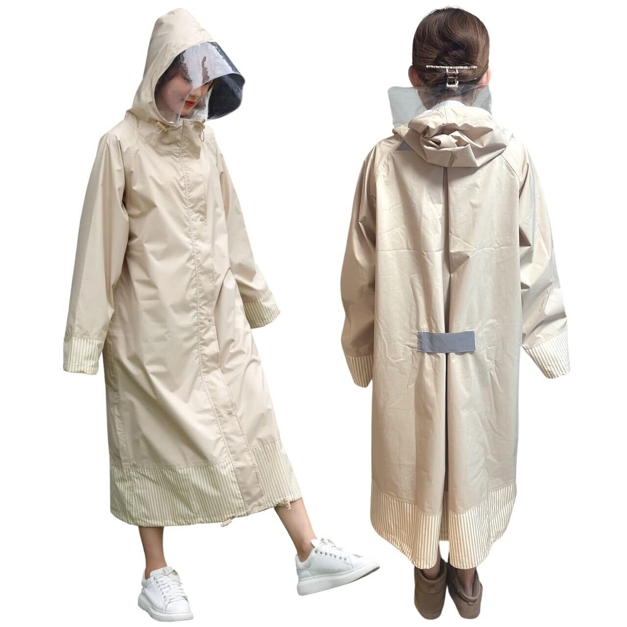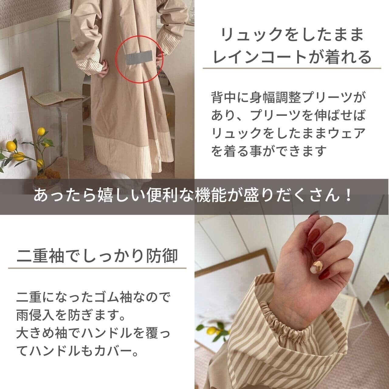 【便利な機能が満載】 雨の日は気持ちが暗くなりがちになるもの。少しでもテンションが上がるように、機能もおしゃれも妥協したくない人のための、高い機能性とデザイン性を両立させたレインコートです。①フードが大きめで透明ツバが雨を防ぎ、視界を守るので傘なしで自転車に乗れます。 ②二重になったゴム袖なので雨侵入を防ぎ、大きめ袖でハンドルを覆ってハンドルをカバー。 ③裾がゴムで絞れ、また伸縮性があるので動いた時にめくり上がるのを防いでくれます。④背中に身幅調整プリーツがあり、プリーツを伸ばせばリュックをしたままウェアを着る事ができます。⑤あったら嬉しいポケットが両側についており、簡単な小物を収納できます。⑥身長が大きい方や足元までカバーしたい人のために大きめサイズもご用意しました。