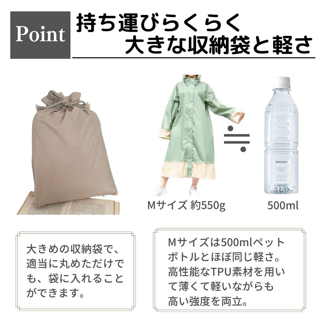【持ち運びラクラク!軽い!】軽さ(Mサイズ:約0.55g、Lサイズ:約:0.65g)を実現し、ゴム臭やベタつき感のない素材です。雨天のときは丁寧にたたんでいる余裕がないことが多いため、収納袋も大きめに作られており、適当に丸めただけでも、袋に入れることができます。