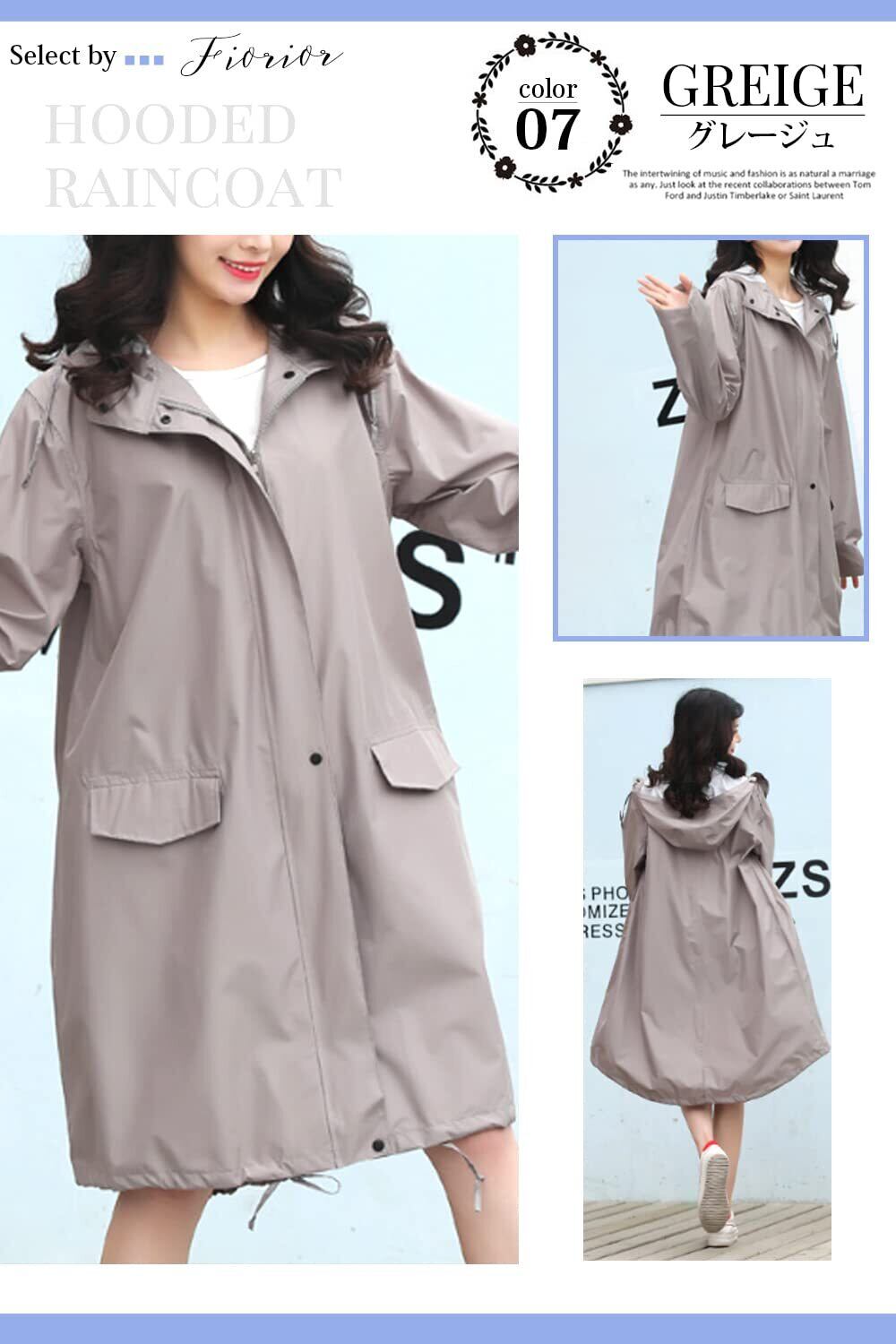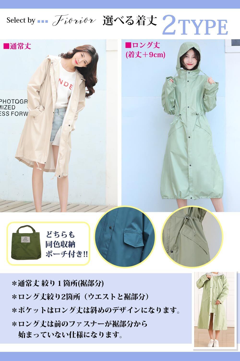 [Fiorior] \選べる着丈2種類/【膝丈/ロング丈】 レインコート おしゃれ レディース 通勤 通学 かわいい 撥水 防水 フード 自転車 バイク 梅雨 袋付き 【シルエットが可愛い】