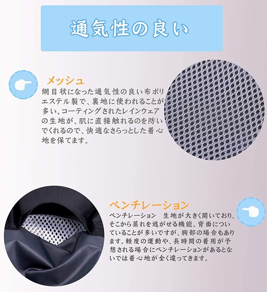 【透湿性能】表面生地(PVC素材)は、水滴よりも小さいな穴が無数に空いており、外からの雨は弾き、ウエア内の蒸れはその穴から逃します。また、裏地全体にメッシュ素材を使用しているため、コーティングされたウェアの生地が、肌に直接触れるのを防いでくれるので、快適なさらっとした着心地を保てます。
