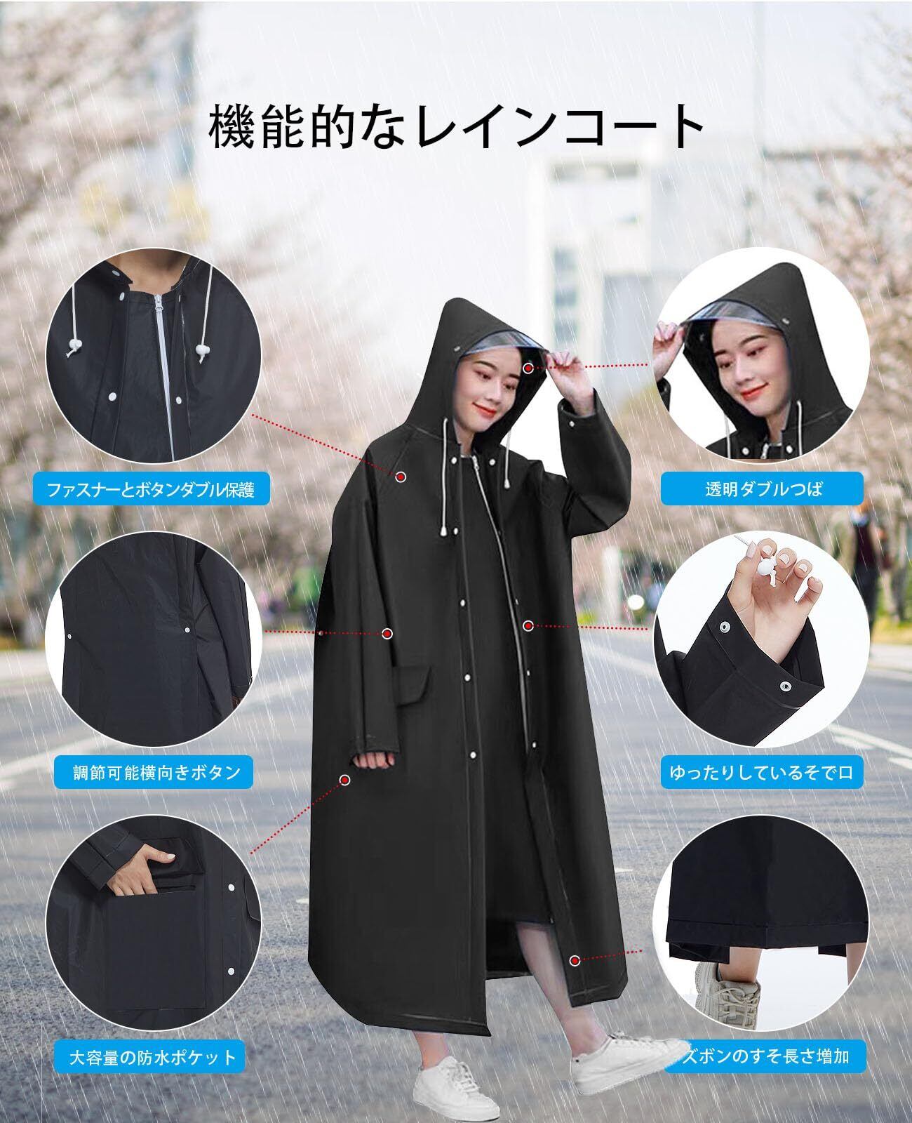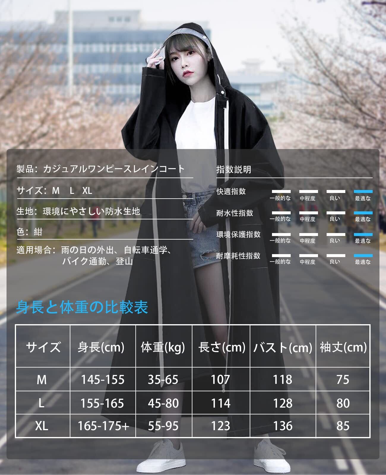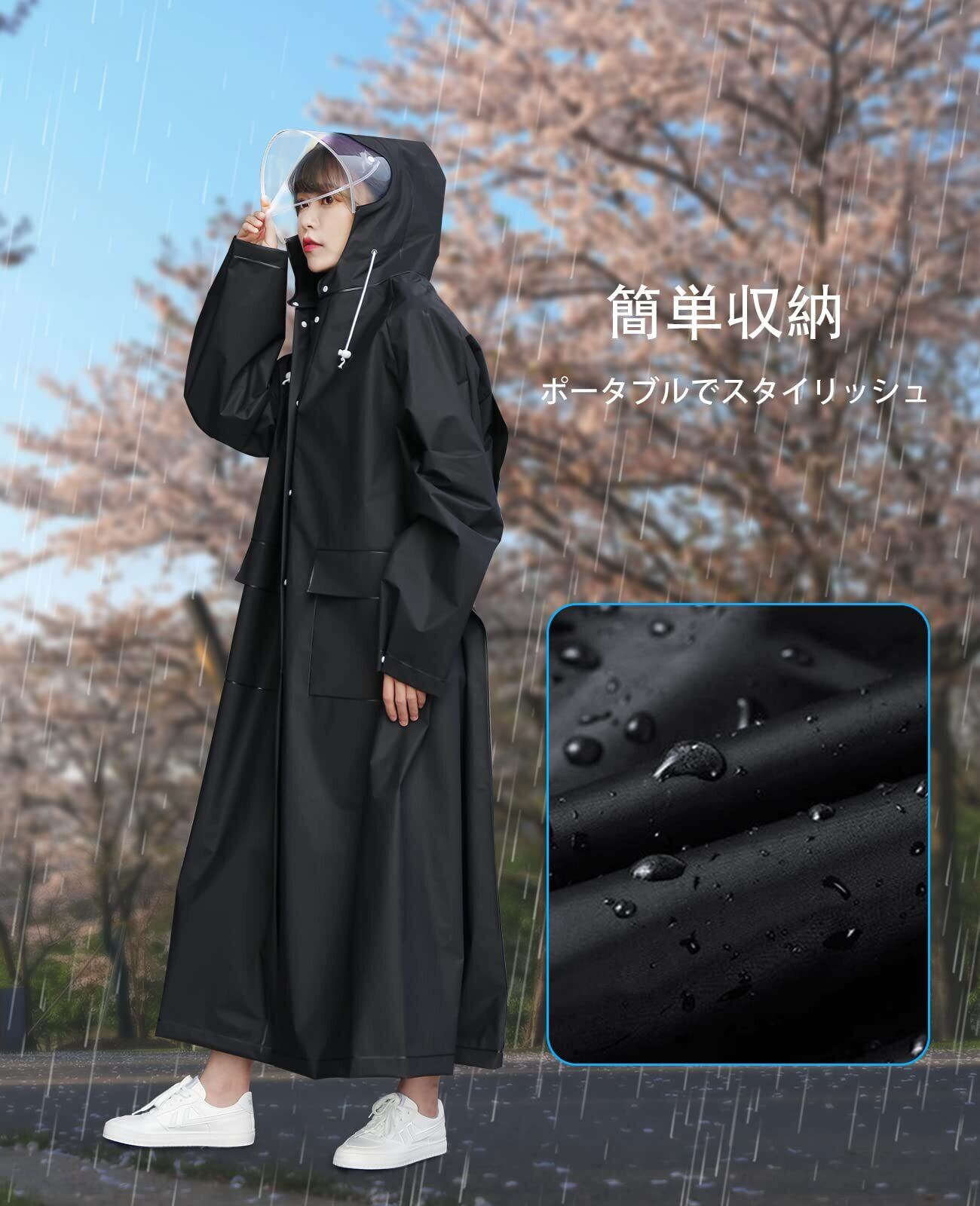 【肌に優しい生地】新型レインコードは柔らかく、耐久性が優れている丈夫なEVA素材を採用しています。ゴムのような弾力性がある素材を使用するレインウェアは、安定性がよく、劣悪の環境に耐えられ、老化しにくく、使用寿命が大幅に伸ばされました。また、EVAは無毒無刺激で、肌と直接に接触しても負担にならないレインコードです。
