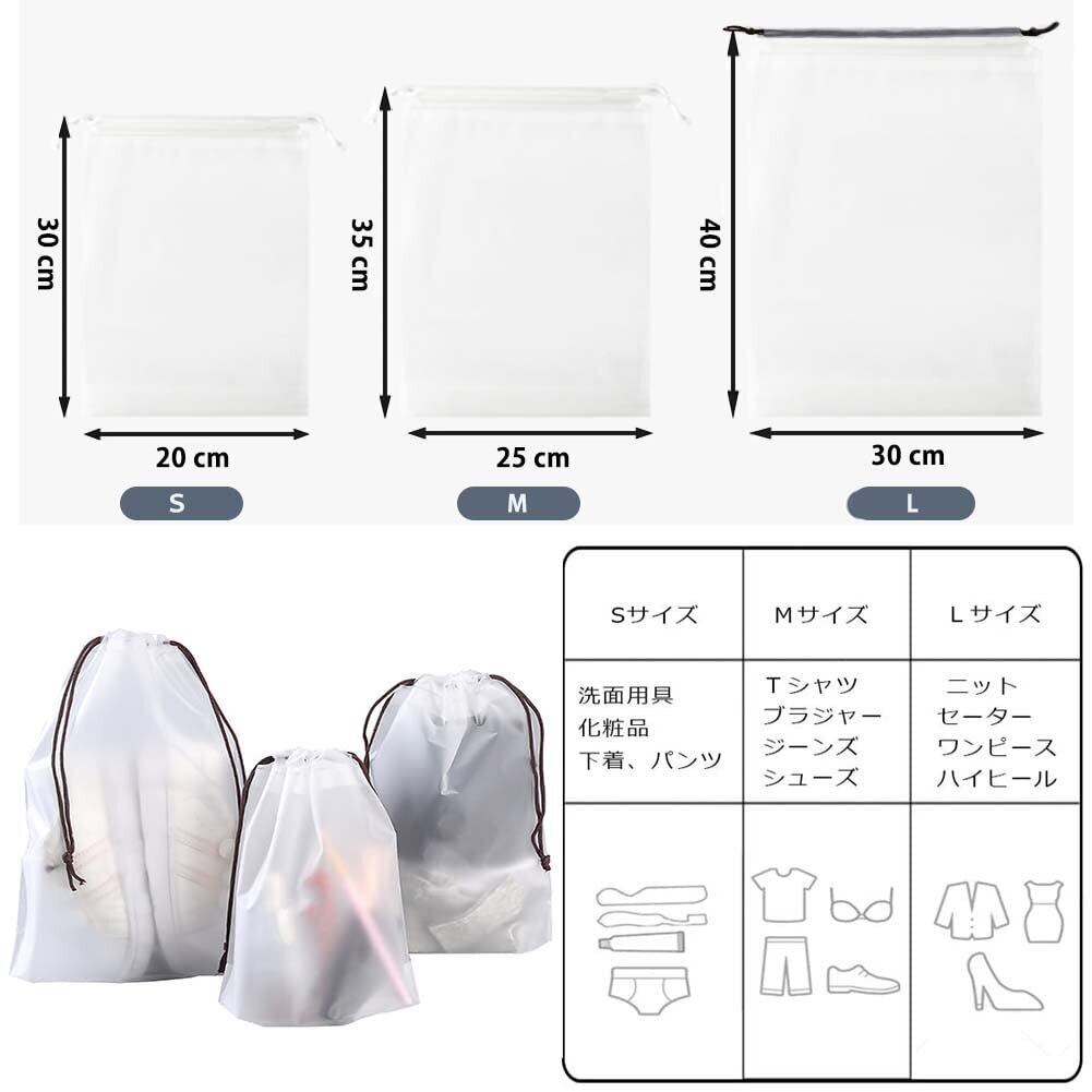 【三種類サイズ】Lサイズ(40*30cm)ⅹ6枚、Mサイズ(35*25cm)ⅹ6枚、Sサイズ(30*20cm)ⅹ3枚;サイズに合わせて、着替え服、水着、下着、タオル、靴、小物などを入れられます。