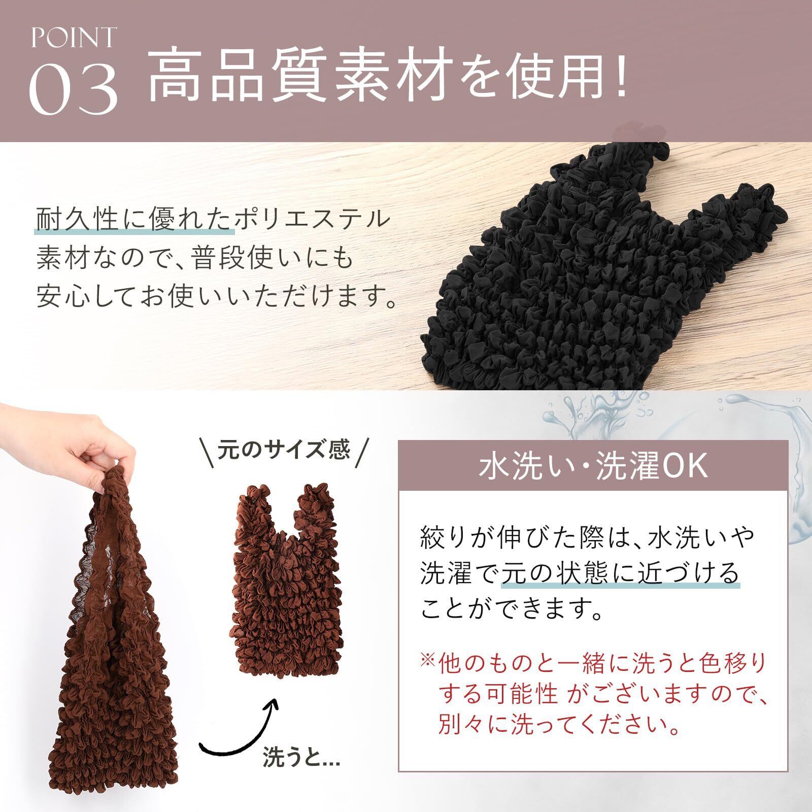 【洗えて清潔・毎日使える】 汚れてもサッと洗える素材なので、清潔に保てて繰り返し使えて経済的。丈夫なポリエステルで毎日の買い物にぴったりです。 ※他のものと一緒に洗うと色移りする可能性があるので、別々に洗ってください。