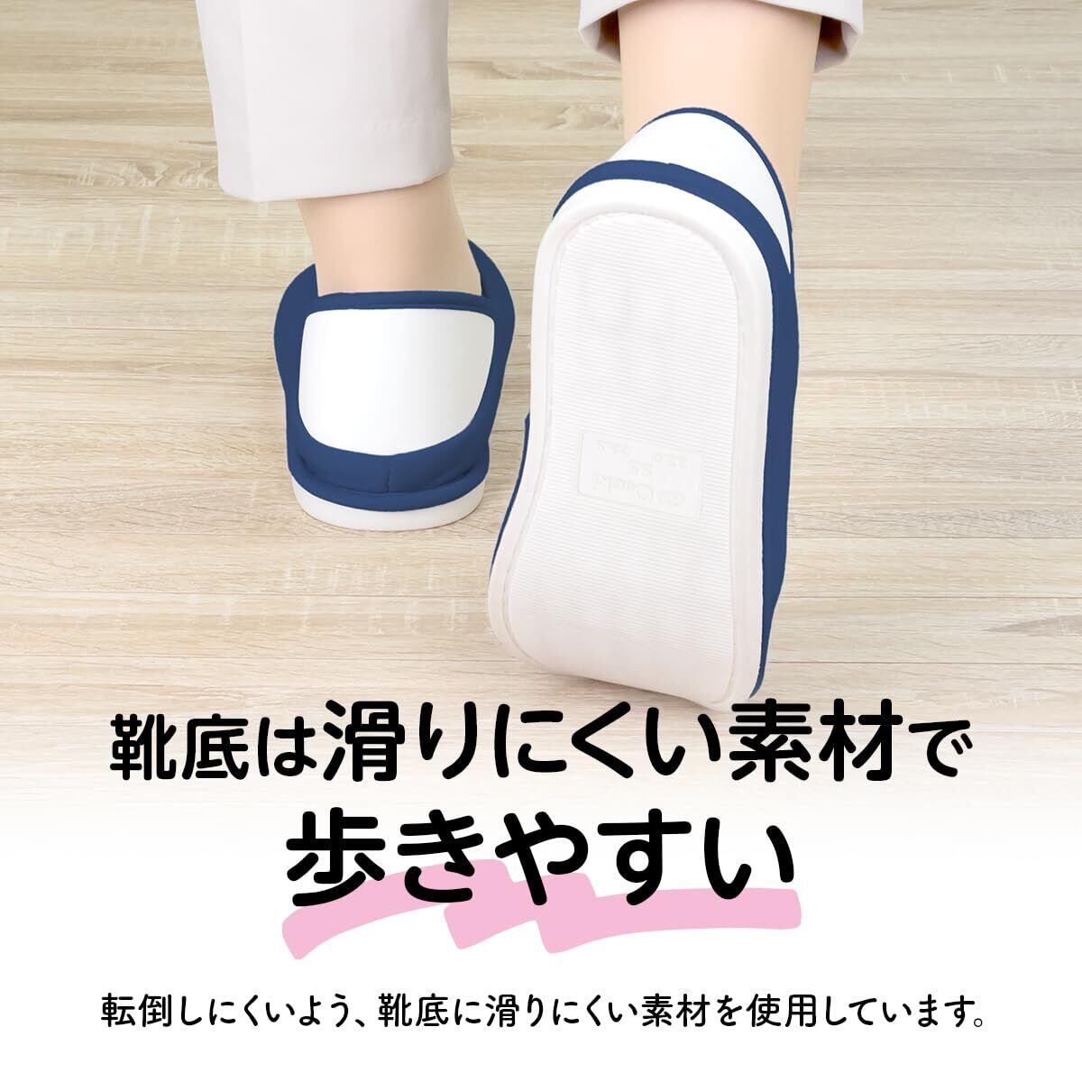 ●かかとが付いているため通常のスリッパと違い、シューズが脱げにくく歩行が安定します。