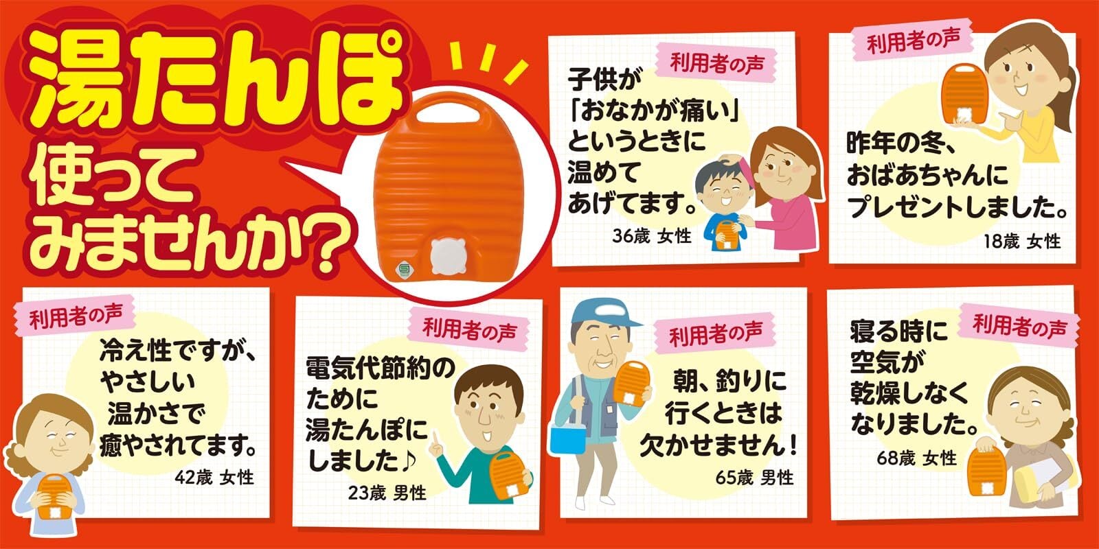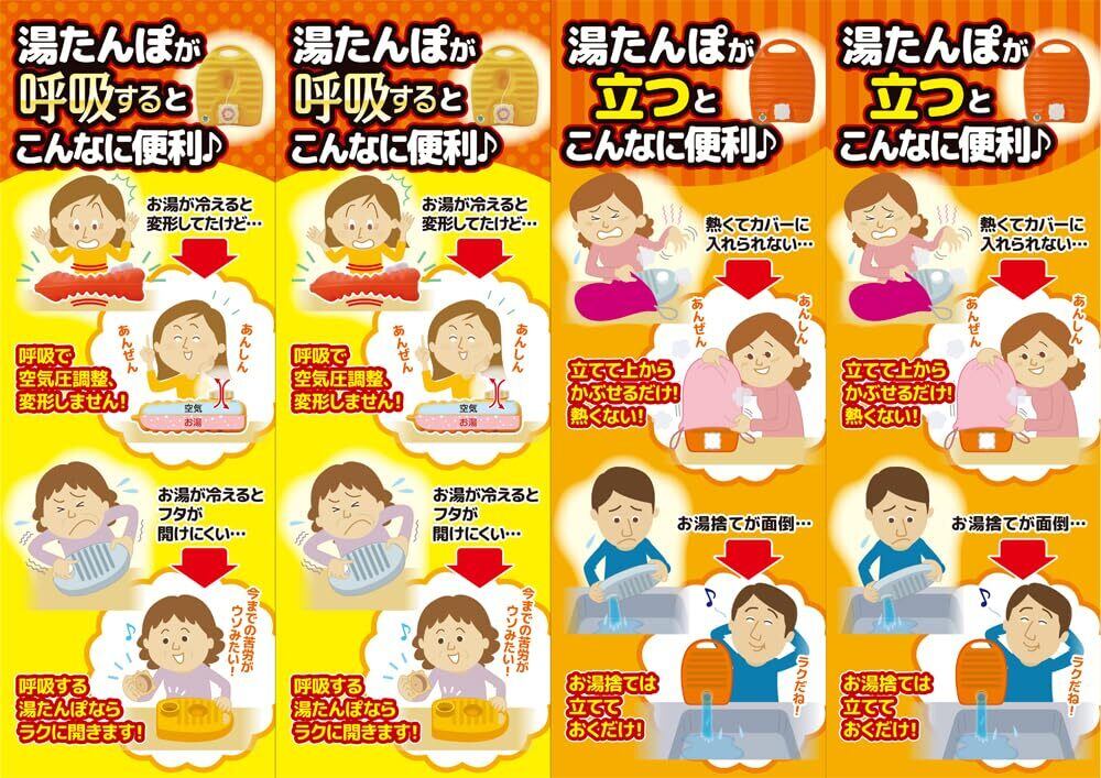 ●ご注意:●湯は口元まで満杯にします。容量不足は変形します。 ●キャップは確実に締めお湯が漏れないことを確認して下さい。 ●肌の弱い方はもう一枚厚手の布等で包むか、低めのお湯でお使い下さい。