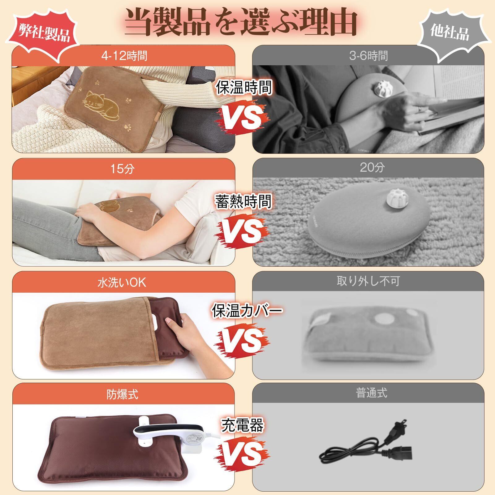 【30日以内の返金・安心・メリット】当商品はご購入日から6ヶ月間の安心が付いています。不具合の場合、返品/交換/返金にて対応いたします。当商品に不明な点がございましたら、お気軽にお問い合わせください。ご連絡の方法:「アカウントサービス」→「注文履歴」→「販売元」→「質問する」。【パッケージ内容物 】湯たんぽ本体、保温カバー、防爆充電器、日本語取扱説明書。