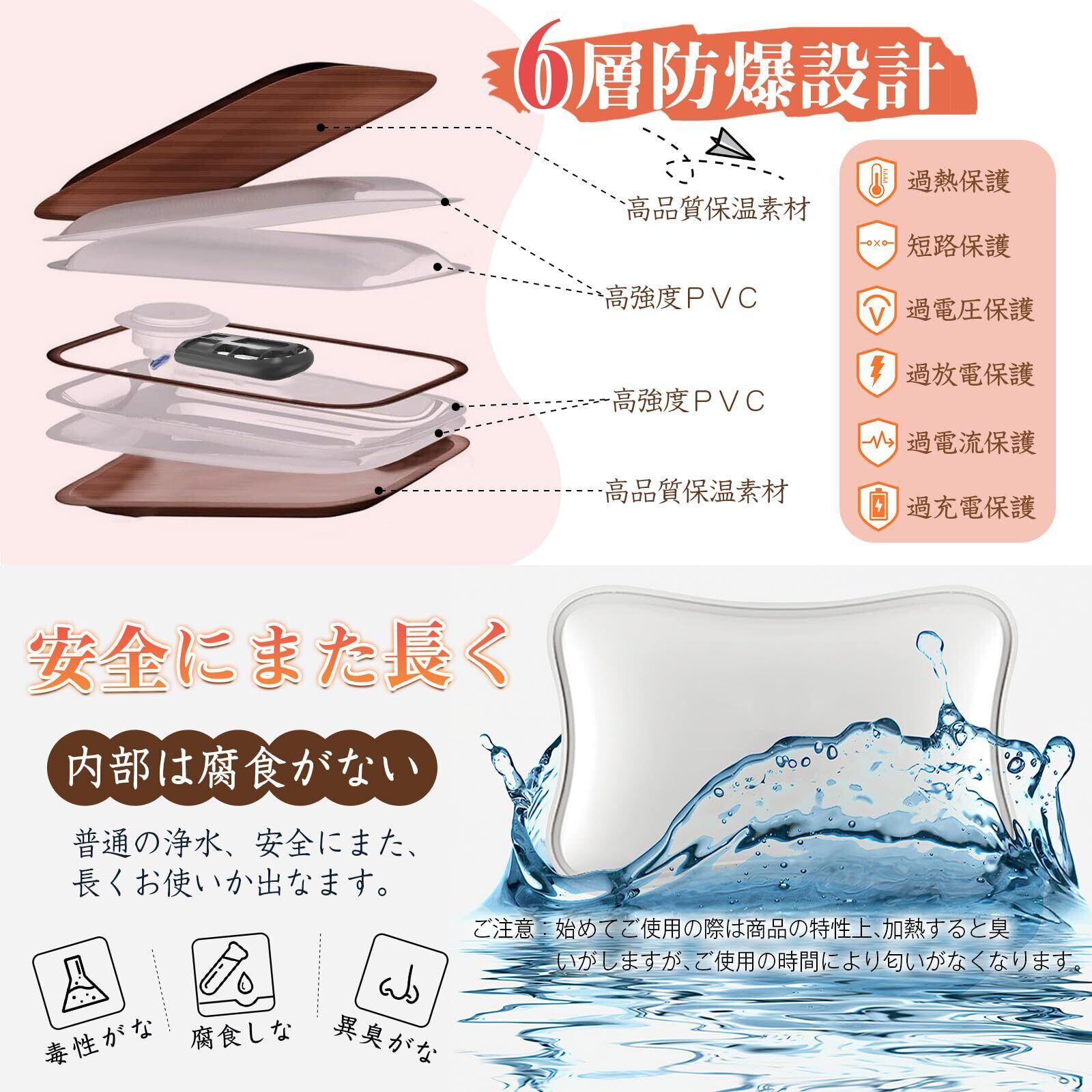 【高品質素材・保温ポケットデザイン】ゆたんぽは異臭がなく、難燃性、耐熱性がある素材を採用して、安心にご利用いただけます。6層防爆設計、腐食しない水で、水と電気の分離設計、温度過熱防止装置は二重保護チップを採用して、防爆充電器で充電時は75℃以上を感知すると自動的に通電を停止します。また、このゆたんぽは保温ポケットデザインで、暖かさが逃しにくく、優しい暖かさに包まれます。