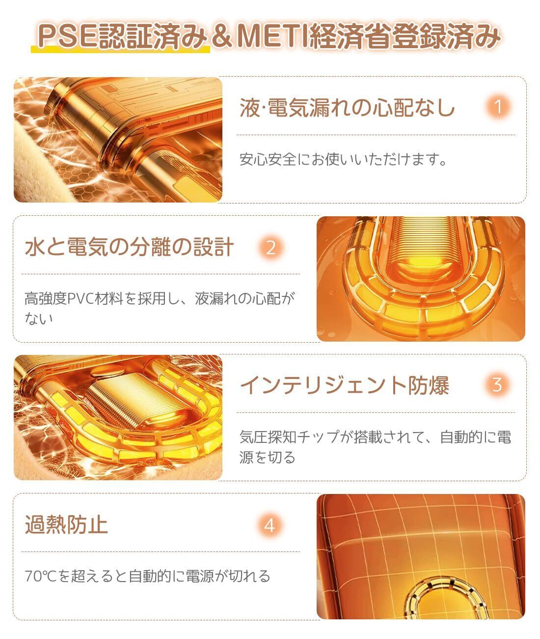 【充電式湯たんぽ-多重安全保護設計&PSE認証済み】湯たんぽは高品質保温素材と高強度PVCの6層防爆設計を採用ております。 温度感知機能が搭載されて、温度過昇の場合に通電は自動的に中止します。また、通電安全装置や過熱防止設計など安全措置があります。水電分離設計の安全措置で、液漏れの心配がない。PSE認証済み&METI経済省登録済み、安心安全にお使いいただけます。
