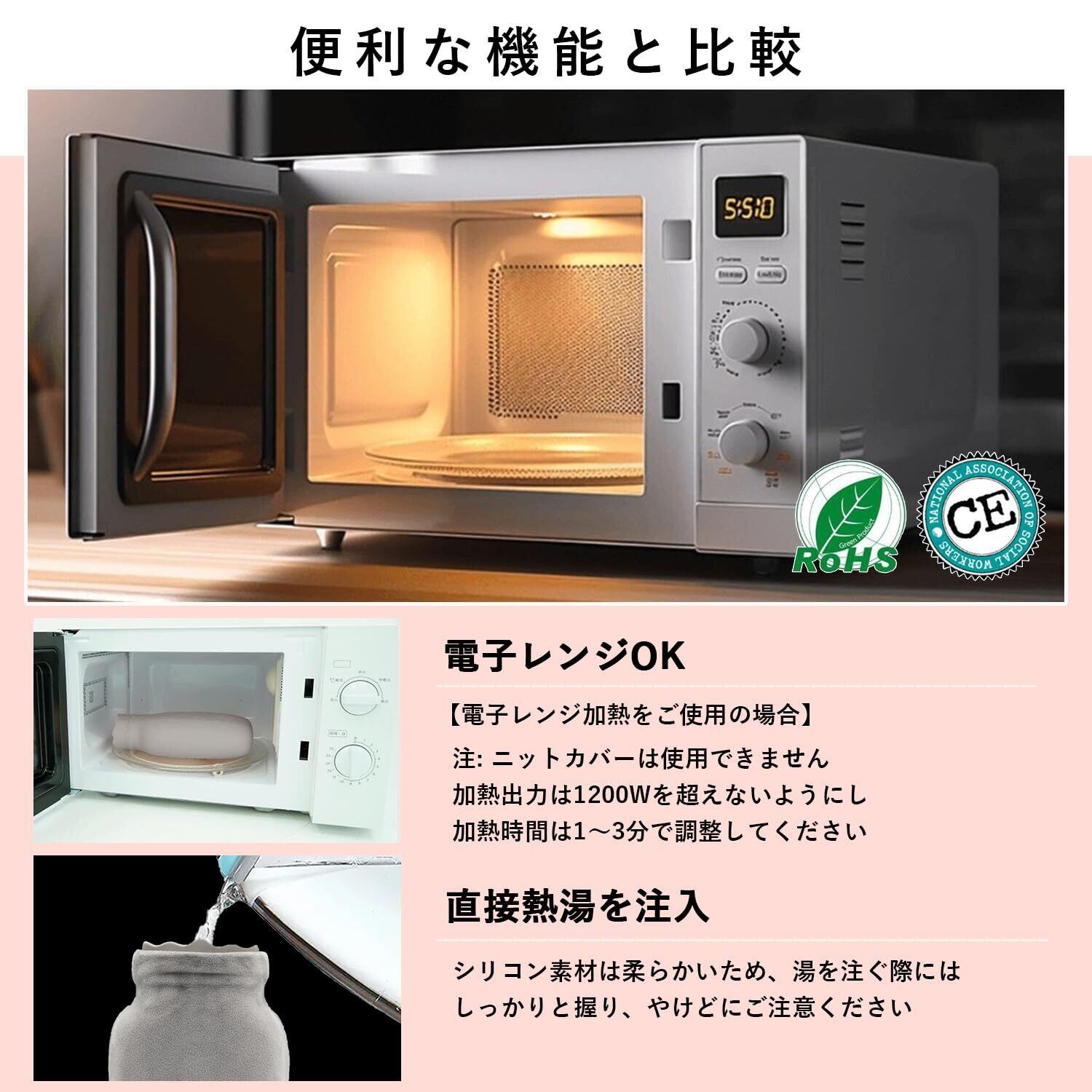 【電子レンジ加熱をご使用の場合】 注: ニットカバーは使用できません。 必ず水を入れて袋内の空気を抜いてネジキャップを締めて漏れがないか確認してください。電子レンジの加熱出力は1200Wを超えず、電子レンジの加熱時間は1分から3分の間で調整し、3分を超えないようにしてください。