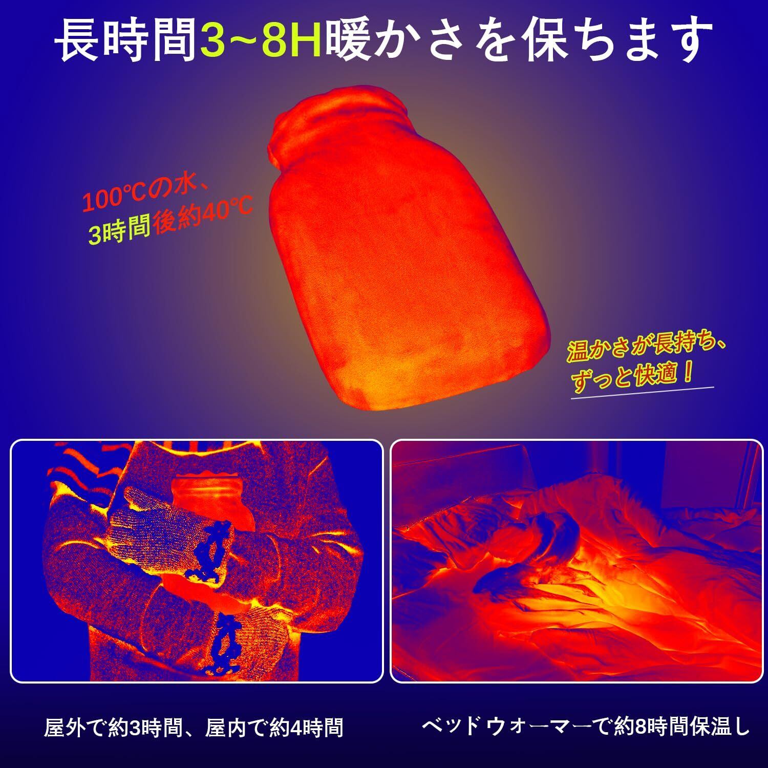 長時間の接触による低温やけどを防ぐため、特に就寝中は湯たんぽを長時間使用しないでください。就寝後は湯たんぽを取り出すのが最善です