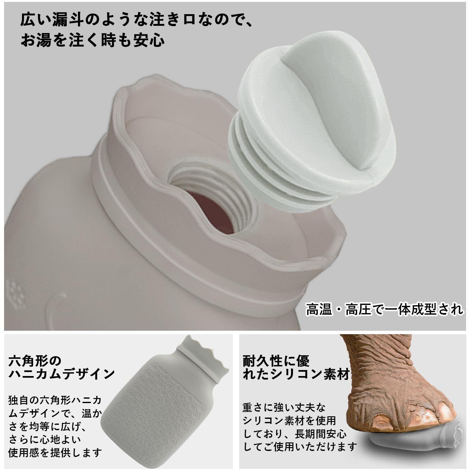 食品級シリコン製で、安全かつ信頼性が高い。容量は1.1Lと大きく、長時間の温かさを提供できます。外観は可愛く、もふもふした質感で手放せなくなります。