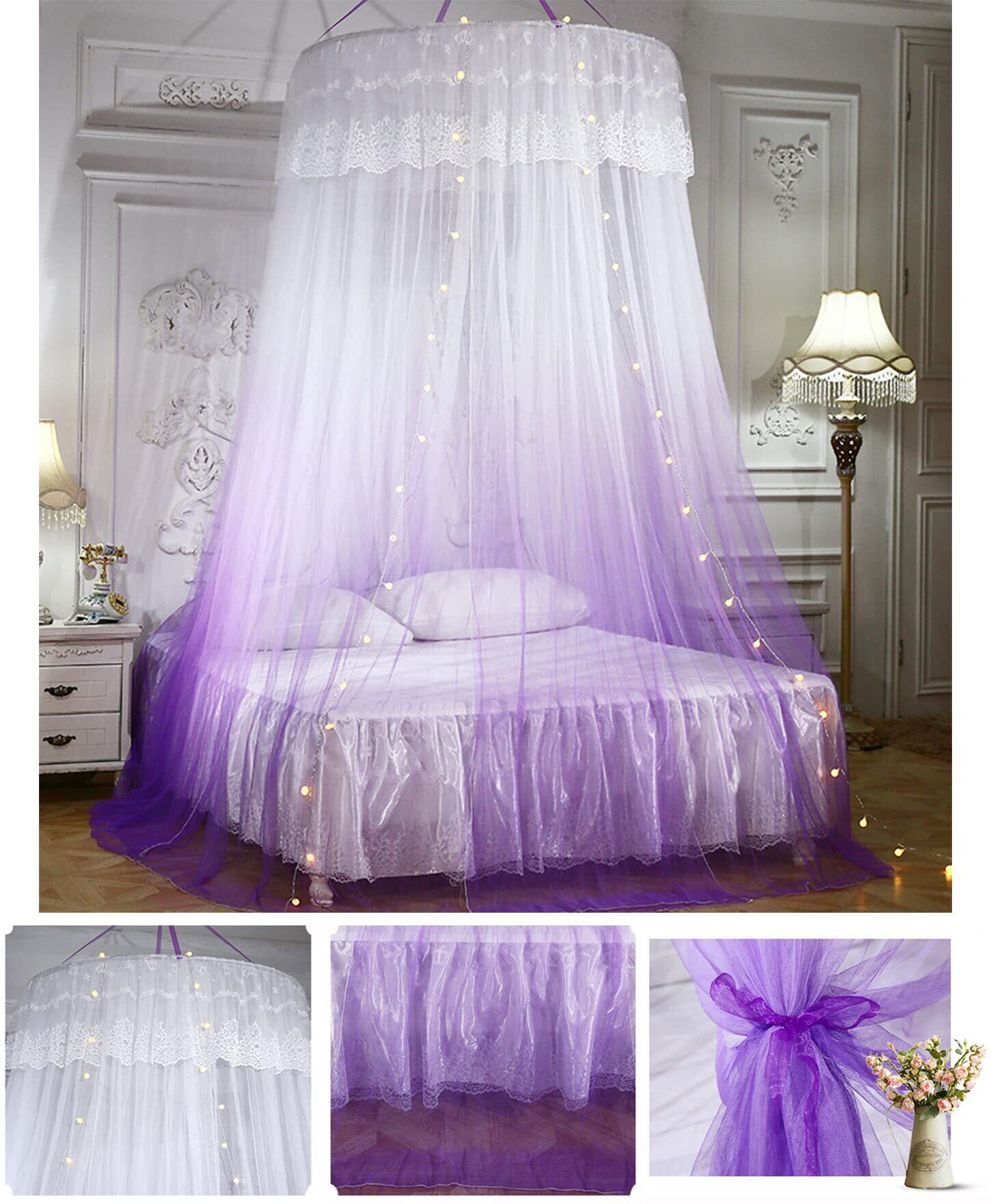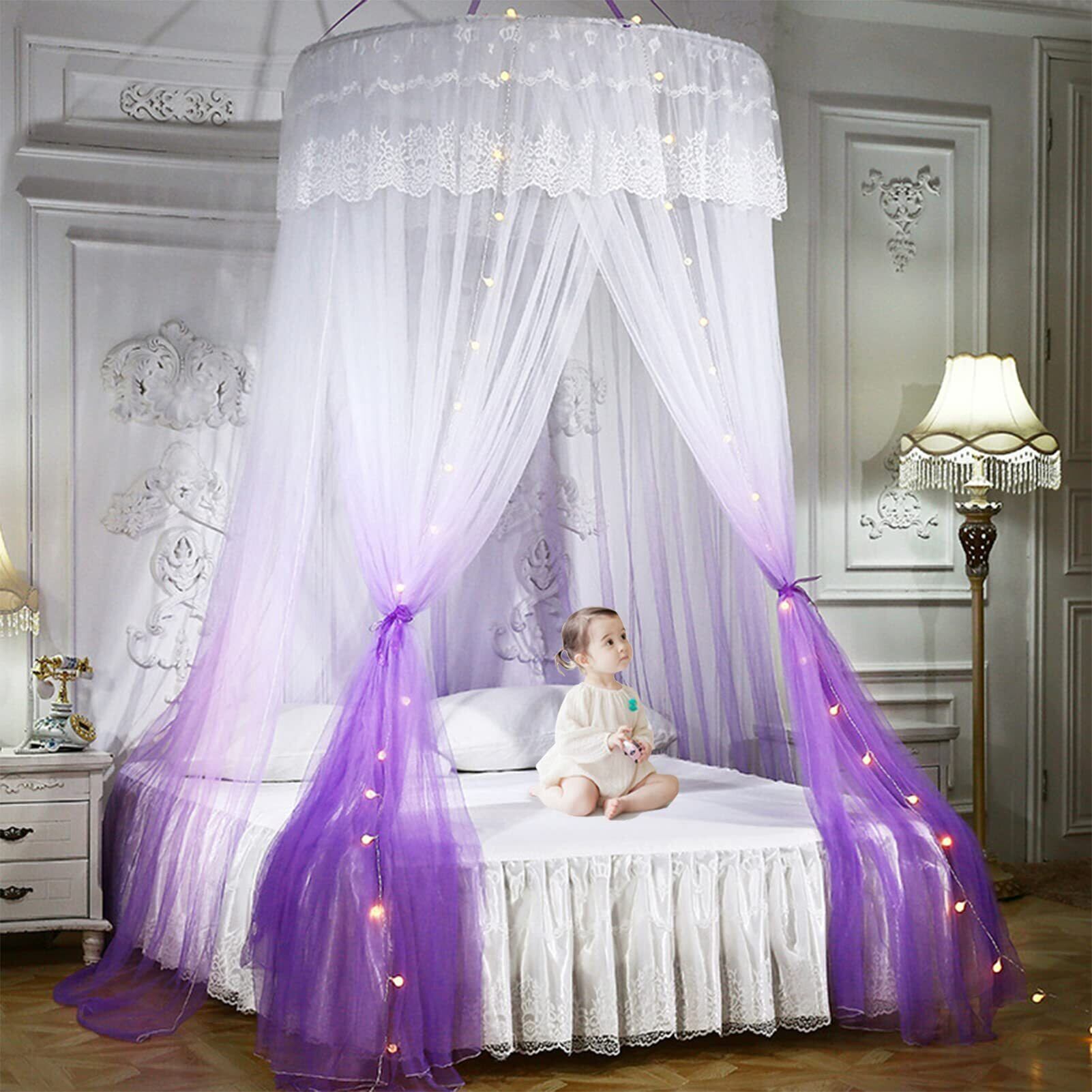 Yangweng 蚊帳 天蓋 吊り下げタイプ 天蓋カーテン 防蚊 昆虫防ぐ 円形蚊帳 ベッドカーテン 部屋飾り モスキートネット 大人用 赤ちゃん用 お姫様 ベッド ソファ 畳 取り付け簡単 LEDライト付き 人気 おしゃれ パープル ベッド幅1.8m