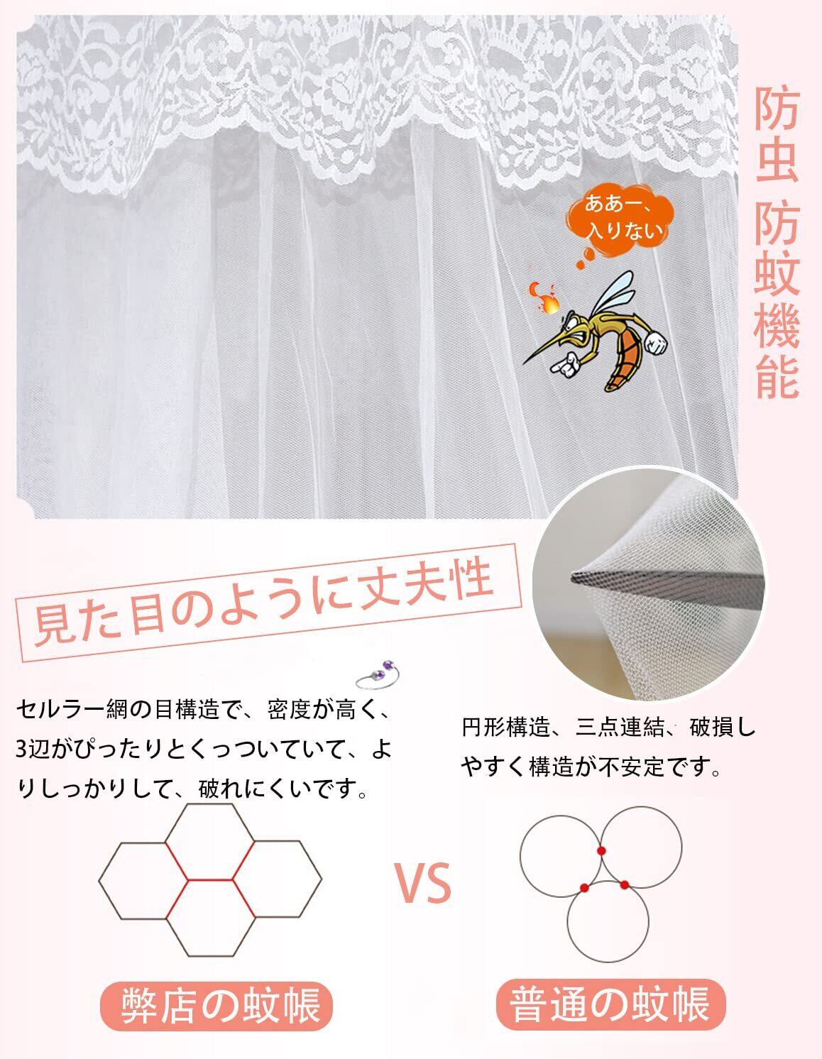 【360°防蚊】セルラー網の目構造で、密度が高く、破れにくく、虫よけにも優れています。長く帳紗は着地式設計して、更に効果的に各類の昆虫を隔絶して、360°死角がなくて全面的に保護します。優雅なお姫様雰囲気な天蓋カーテン、夏に最適です。