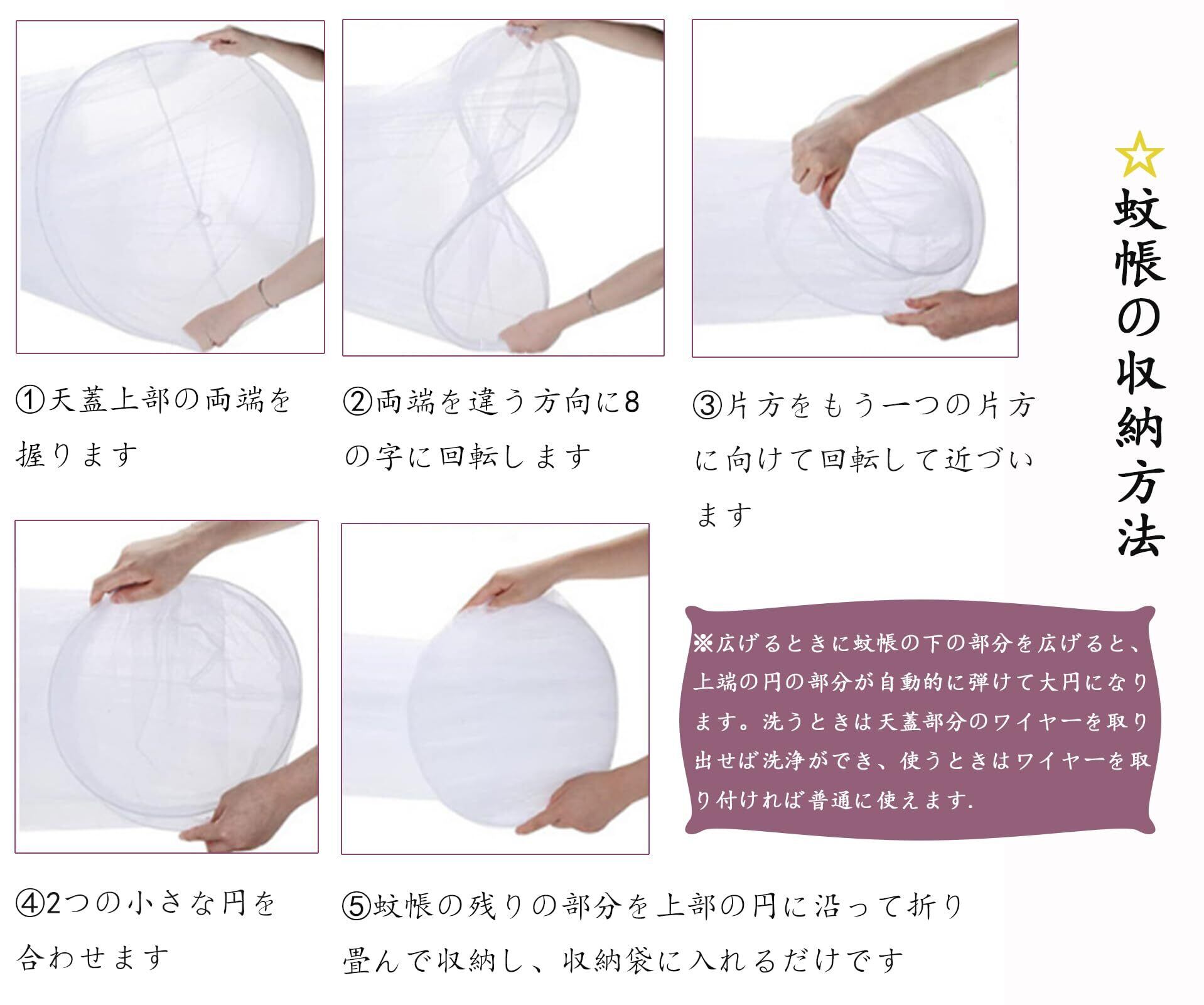 【取り付けと清潔簡単】吊り下げ式の円型蚊帳、組立不要で、天井に専用フックを設置して吊るだけですぐ利用可能、操作がとても簡単です。吸盤を特殊的に加工され、10kgまで耐えられ、耐荷重が強く、安心してお使いいただけます。万が一汚れたら、水で簡単に洗うことができます。