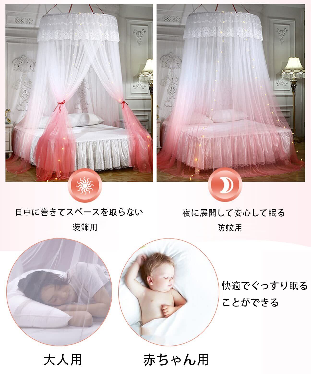 【快適な安眠へ】蚊や飛行昆虫を防ぎ、大人も子供も害虫から守ってくれて、安心して眠れます。天井から吊って、ゆるやかに周囲の視線や光を遮ったり、大空間のスペースを与え、人に安心感を十分に感じさせます。陽射し、ランプの光を柔く、ぐっすり眠ることができます。